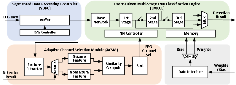 近期,在芯片领域两大顶级会议Design Automation Conference (DAC)和Custom Integrated Circuits Conference (CICC)上,太阳成集团tyc151cc周军教授团队宣读了在低功耗AI芯片方向的最新两项工作:(1)超低功耗脑电AI处理芯片“An Energy-Efficient Seizure Detection Processor using Event Driven Multi-Stage CNN Classification and Segmented Data Processing with Adaptive Channel Selection” (2)超低功...