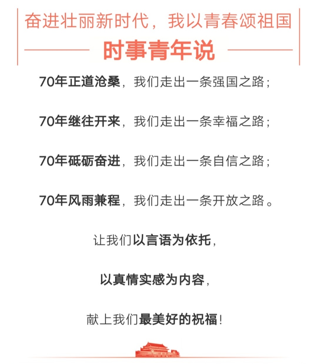 为庆祝中华人民共和国成立70周年,信息与通信党委研究生党建委员会组织开展时事青年说特别活动——奋进壮丽新时代,我以青春颂祖国。此次活动以“我和我的祖国”为主题,以党建委员会微信公众号为载体,为青年学子搭建对祖国表达美好祝福的平台。活动一经推出,同学们纷纷献上对祖国的强势表白,或是写给祖国的三行情书,或是歌颂祖国的一句赞歌,亦或是一句简单朴素的话语。精彩评论如下:“70年沧桑巨变,70年风雨兼程。从...