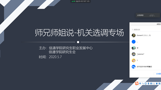 2020年5月7日晚7点,公司研究生职业发展中心和研究生会联合举办线上第五场“师兄师姐说”之机关选调专场活动。本场分享会有幸邀请到5位优秀的师兄师姐,他们分别是签约中国共产党重庆市委员会组织部的石昌林,四川省成都市市委组织部的王诗鑫,四川省成都市市委组织部的王秋月,江苏常州公安局的易鑫,和分享多省选调生经验的徐榕键。分享内容主要包括选调流程,笔试面试经验和后续培养等,吸引共计270余名同学参加。石昌林师兄...