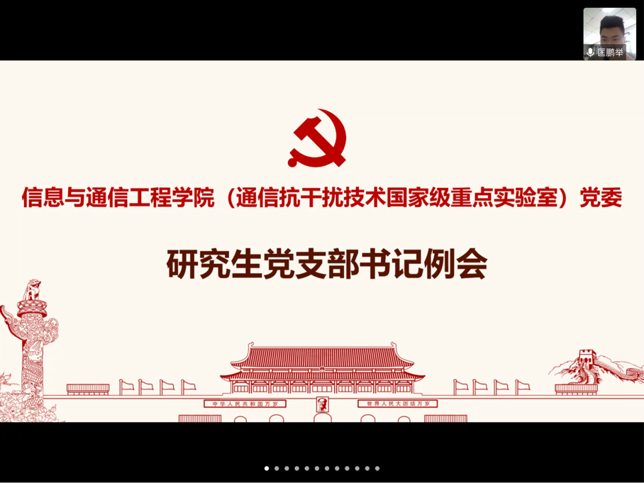 2020年5月9日,太阳成集团tyc151cc(通信抗干扰技术国家级重点实验室)党委于腾讯会议线上平台召开研究生党支部书记例会。各个研究生党支部书记参加了此次云会议,会议由公司研究生辅导员匡鹏举主持。会上,匡鹏举对疫情期间各支部书记的线上工作表示肯定,鼓励大家继续利用网络平台开展有序、有力的党组织生活,提醒研究生党支部书记一学年的工作即将结束,大家要做好支部的总结工作,着手准备“先进研究生党支部”创建评优...