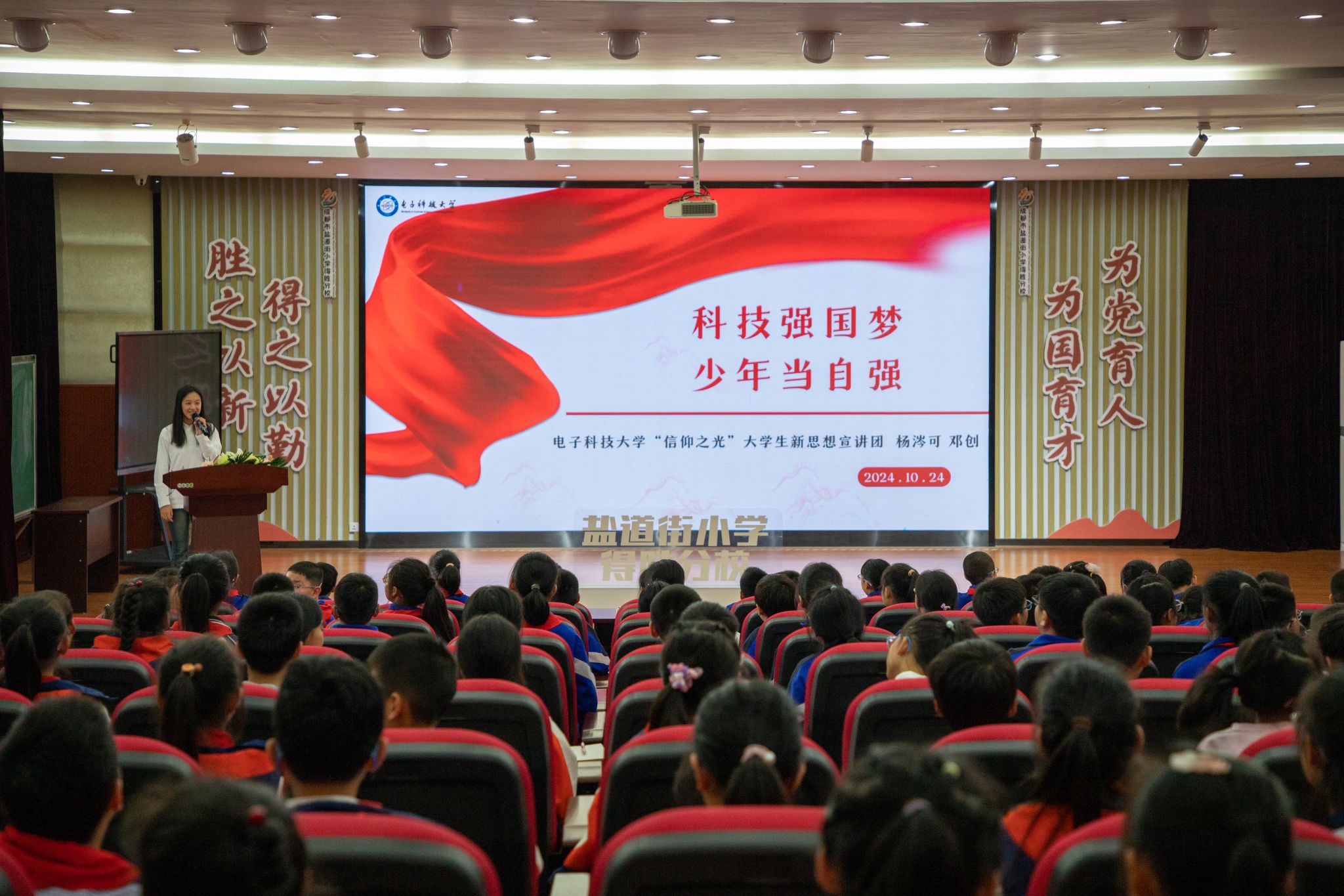 今年是中国第一颗原子弹爆炸成功60周年,为了传承弘扬航天精神,10月24日,“信仰之光”老员工新思想宣讲团联合中国航天科工二院二十三所航天精神科普宣讲团,走进成都市盐道街小学得胜分校,以“科技强国梦 少年当自强”为主题,围绕成电建校史、航天精神等,为200余名员工带来微党课宣讲。航天精神科普宣讲团的张老师通过丰富的图片和史实资料,讲述了一代代航天人不忘初心、攻坚克难的奋斗故事,展现我国航天事业不断攀登高...