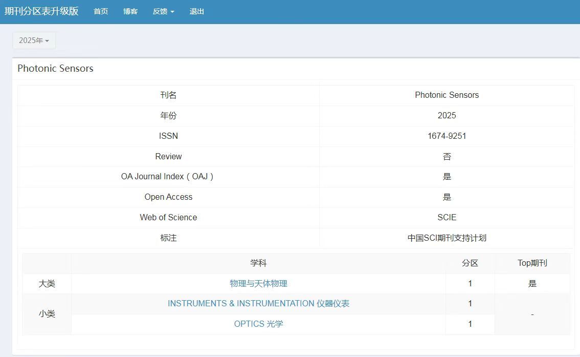 近日,受国内学术界高度关注的中国科公司文献情报中心2025年期刊分区表正式发布,公司主办的《Photonic Sensors》(简写为PhoS,中文刊名为《光子传感器》)首次进入中科院期刊大类分区的物理与天体物理1区,小类分区的仪器与仪表与光学1区。这是继PhoS于2023年首次进入JCR Q1区和中科院2区后,再次取得的突破性进展。PhoS作为公司信息与通信工程A+学科唯一的国际学术期刊,横跨仪器仪表与光学两个学科,对提升公司信息与通信工...