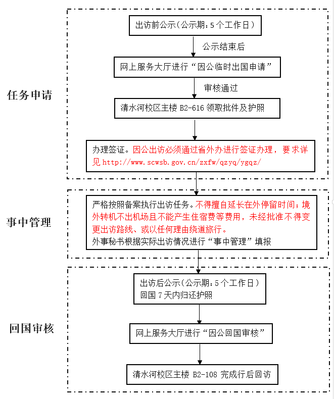 办理流程图如下,具体要求详见国际处网站https://www.oice.uestc.edu.cn/content.jsp?urltype=news.NewsContentUrl&wbtreeid=1155&wbnewsid=6113