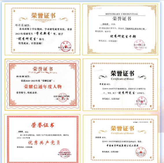 功夫不负有心人,在攻读博士学位期间,邱荷茜厚积薄发,在科研实践中摘取众多优异成果,入选首批四川省博新计划、2022年度成电杰出员工、荣耀信通年度人物、太阳成集团tyc151cc“学术新秀”,并荣获川渝博士后学术成果展示一等奖、学业一等奖学金、深圳证券交易所奖学金、中电集团专项奖学金等诸多荣誉。