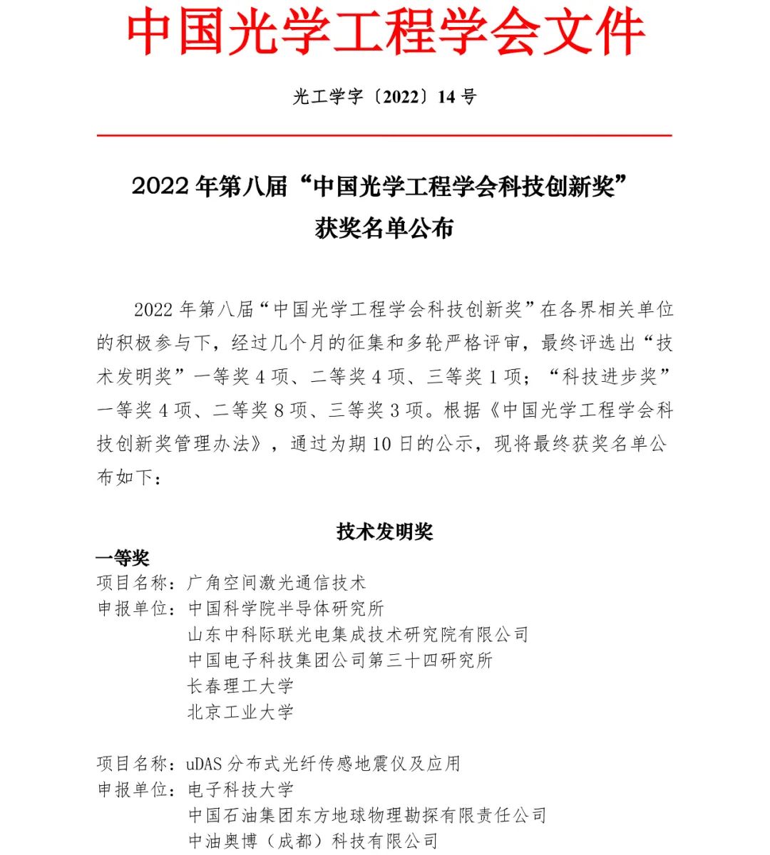 近日,第八届“中国光学工程学会科技创新奖”评选结果揭晓,公司饶云江教授团队与中国石油集团东方地球物理勘探有限责任公司和中油奥博(成都)科技有限公司联合申报的“uDAS分布式光纤传感地震仪关键技术及应用”成果通过多轮严格评审,荣获“中国光学工程学会科技创新奖”技术发明一等奖(获奖人:饶云江、冉曾令、王熙明、苟量、王子南、李彦鹏)。