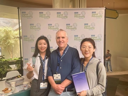 图4指导的博士生龙珍、刘佳妮与美国三院院士Michael Jordan教授(加州伯克利教授,机器学习国际著名专家)在ICASSP 2023的交流合影。她们合作撰写的专著(合照中书籍)由Michael Jordan教授推荐发表在其任主编的FnT Machine Learning(影响因子:32.8)上