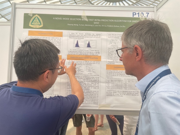 图3朱策教授与Andre Kaup教授(IEEE Fellow,德国埃尔朗根-纽伦堡大学教授)在ICASSP 2023上进行学术交流讨论