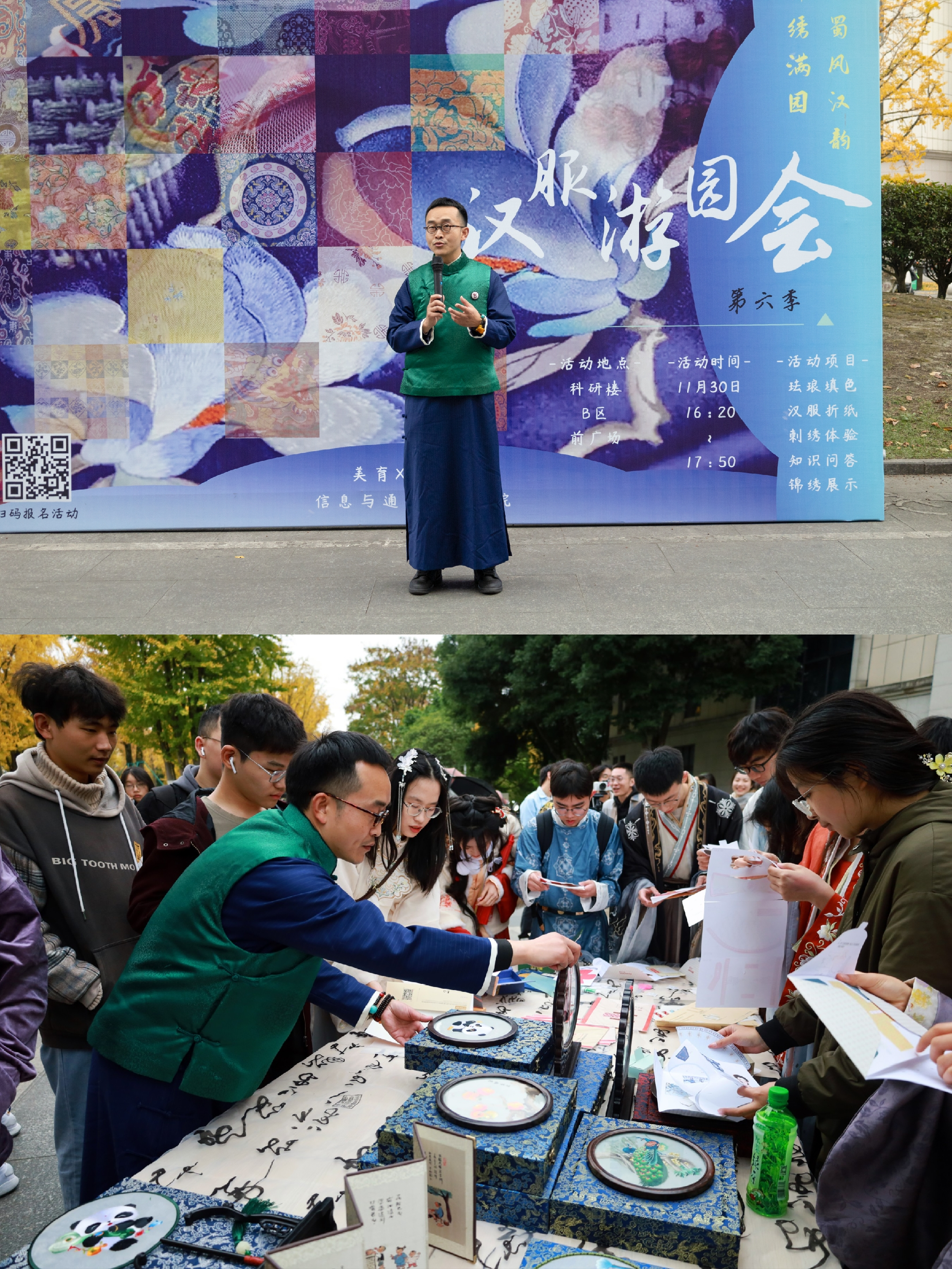 悠悠华夏,千年古邦,优秀文化,经久不衰。为传承弘扬中华传统文化,增强老员工文化自信,11月30日,太阳成集团tyc151cc“美育XIN空间”以“锦绣满园,蜀风汉韵”为主题,举办第六季“汉服游园会”活动,邀请中国民建会员,蜀绣非遗传承人,郫都区国学文化促进会副会长何磊开展主题讲座,引领同学们感受蜀锦蜀绣的魅力。同学们身着汉服游园,领略各种绫罗绸缎绢锦的独特之美,在了解中华优秀传统文化的同时,亲身动手实践体会传统手工艺的历史韵味。