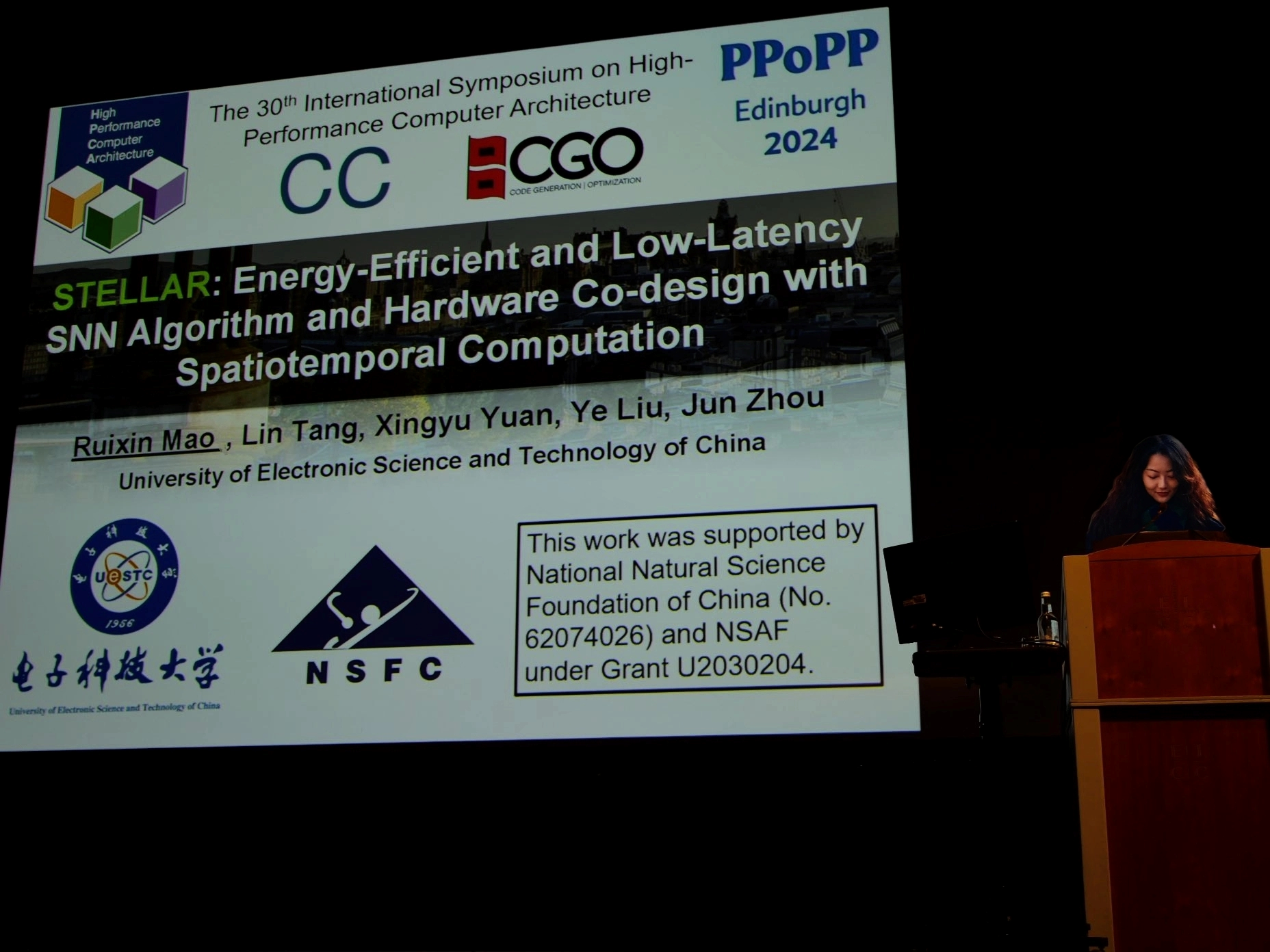 近日,太阳成集团tyc151cc周军教授团队在计算机体系结构领域顶级会议International Symposium on High-Performance Computer Architecture (HPCA) 2024上宣读了团队在类脑计算芯片方向的研究工作“STELLAR: Energy-Efficient and Low-Latency SNN Algorithm and Hardware Co-design with Spatiotemporal Computation”。HPCA是由IEEE举办的计算机体系结构领域的顶级会议,涵盖处理器架构、并行计算、存储系统等主题,也被视作计算机体系结构研究的风向标,中国大陆作为第一作者单位的论文平均每年的接受数量小于10篇。该论文是太阳成集团tyc151cc首次在HPCA上发表论文,标志着太阳成集团tyc151cc在类脑计算芯片领域取得重要进展。今年HPCA共收到410篇投稿,最终接受75篇,录用率为18.3%。该论文的通讯作者为周军教授,第一作者为周军教授的博士生毛睿昕,共同作者包括周军教授的研究生唐林(硕),袁兴禹(硕)和刘野(博)。