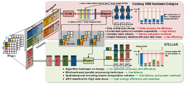 然而,现有的类脑计算芯片面临两个问题: 1. SNN模型为了达到高准确率,需要较长的计算时间窗口和较多的脉冲数量,导致硬件实现能效低、延迟高。2. 脉冲发放具有不规则稀疏性和时间依赖性,导致硬件数据复用率低,且难以支持并行计算。针对上述挑战,我们提出了基于模型与架构协同设计的类脑计算芯片架构STELLAR。在计算模型上,我们基于国际上最新发表的Nature论文,提出了一种具有极小时间窗、极少脉冲的学习机制,训练得到的SNN模型仅需要少量计算即可达到较高的准确率。在硬件架构上,我们提出了一种新的类脑计算架构来利用该计算模型带来的稀疏性,从而实现高并行和高能效计算;同时,在此基础上提出了基于窗的并行计算架构和基于时空编码的稀疏计算架构,进一步提升了计算并行度和能效。与现有架构相比,在达到相同准确率的前提下,大幅提升了计算能效和速度(计算能效提升了8倍,速度提升了7倍)。