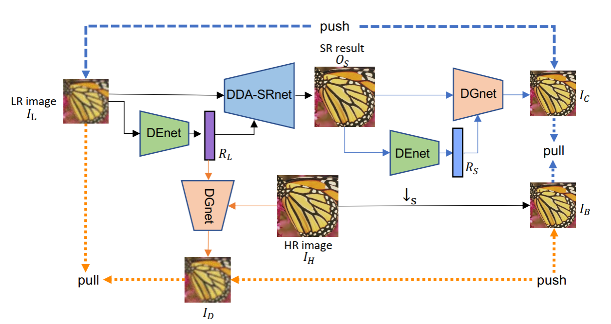 图6:双路循环对比学习框架的展示:DEnet是退化表达提取网络,DDA-SRnet是退化引导超分辨率网络。DGnet是退化网络。