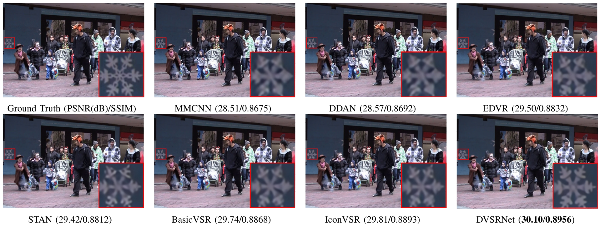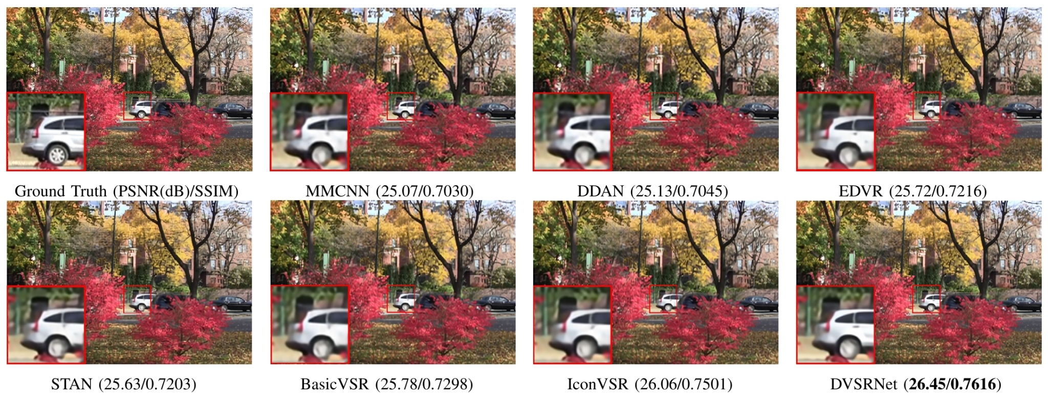 DVSRNet与近年来视频超分辨率的多个SOTA方法在已有的公开测试数据集上进行了实验,DVSRNet在数值与可视化结果的对比上(图2),均取得了最优的效果,同时具备了较低的参数量。