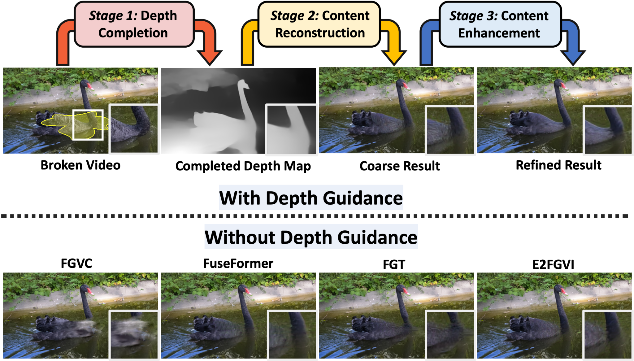 视频修复算法旨在为破损的视频区域填充合理的内容,可用于去除视频内指定目标、修复受损老电影等场景,在视频编辑和视频特效领域发挥着关键作用。随着深度神经网络的发展,基于深度学习的视频修复算法取得了显著进步。然而,当待修复区域同时涉及前景和背景时,视频修复仍然存在极大困难,由于待修复区域缺乏先验信息导致修复结果极易出现伪影。为了解决这一技术挑战,该工作提出了一种基于景深信息引导的深度学习视频修复算法(DGDVI)。