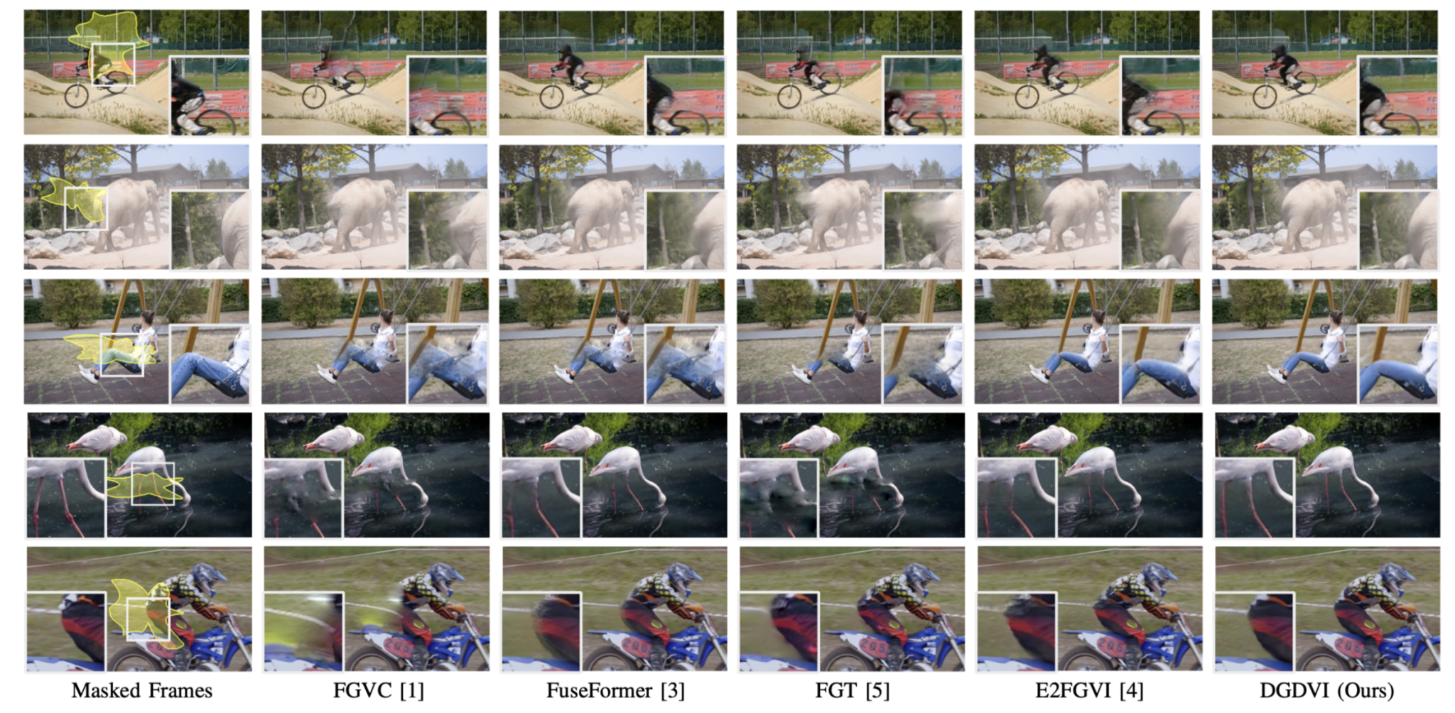 论文将DGDVI与当前主流视频修复算法进行了对比(图4和图5),通过对比也验证了将景深信息用于引导视频修复的有效性(图4),也体现除了DGDVI算法的优异性能。