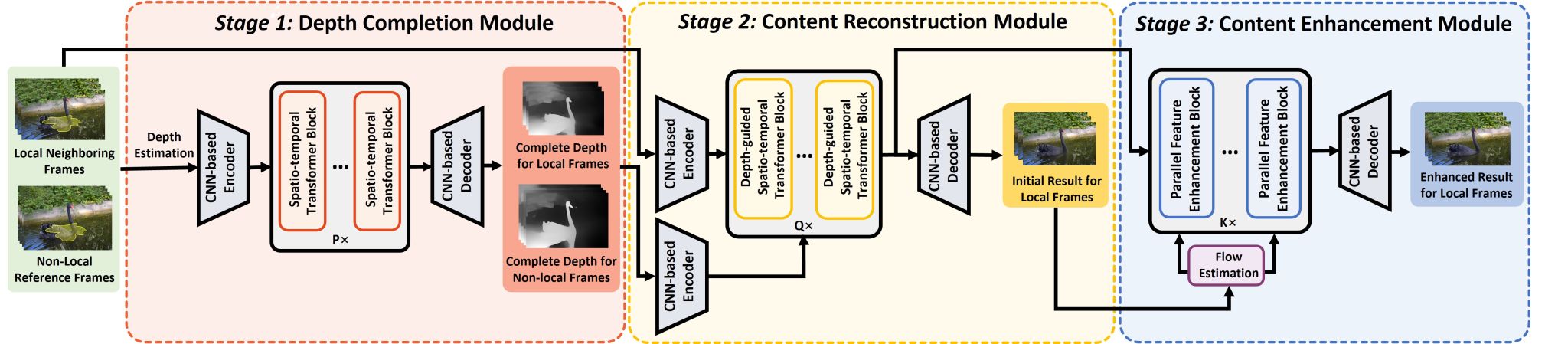 该项工作首次将景深信息应用于基于深度学习的视频修复算法研究中(图3)。首先利用时空多维度信息对视频及其破损区域的景深信息进行估计,预测完整、合理的景深信息。在此基础上,通过构建景深信息引导的内容修复模型,使用视频全局参考信息对破损区域内容进行重建,并进行时序一致性增强,从而获得内容合理且视觉效果令人满意的修复结果。