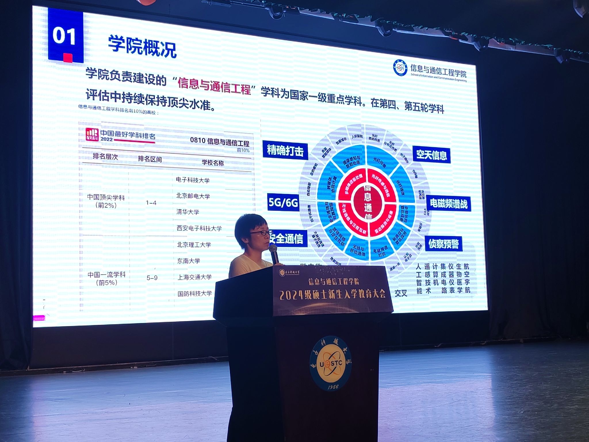 首先,党委副书记何佳对公司的基本情况、团队力量、科学研究、人才培养等方面进行了介绍,她希望同学们能用好公司的平台,努力成为信息通信领域创新拔尖人才和卓越工程师。随后,何书记向全体新生播放了胡俊董事长在2024年中国网络文明大会上演讲的视频,胡董事长通过三张照片分别讲述了王祖耆教授、刘盛纲院士、李少谦教授的故事,何书记希望同学们能从前辈科学家的身上继承发扬成电人的红色血脉,为民族电子工业振兴、国防事业进步和科技创新发展做出贡献。