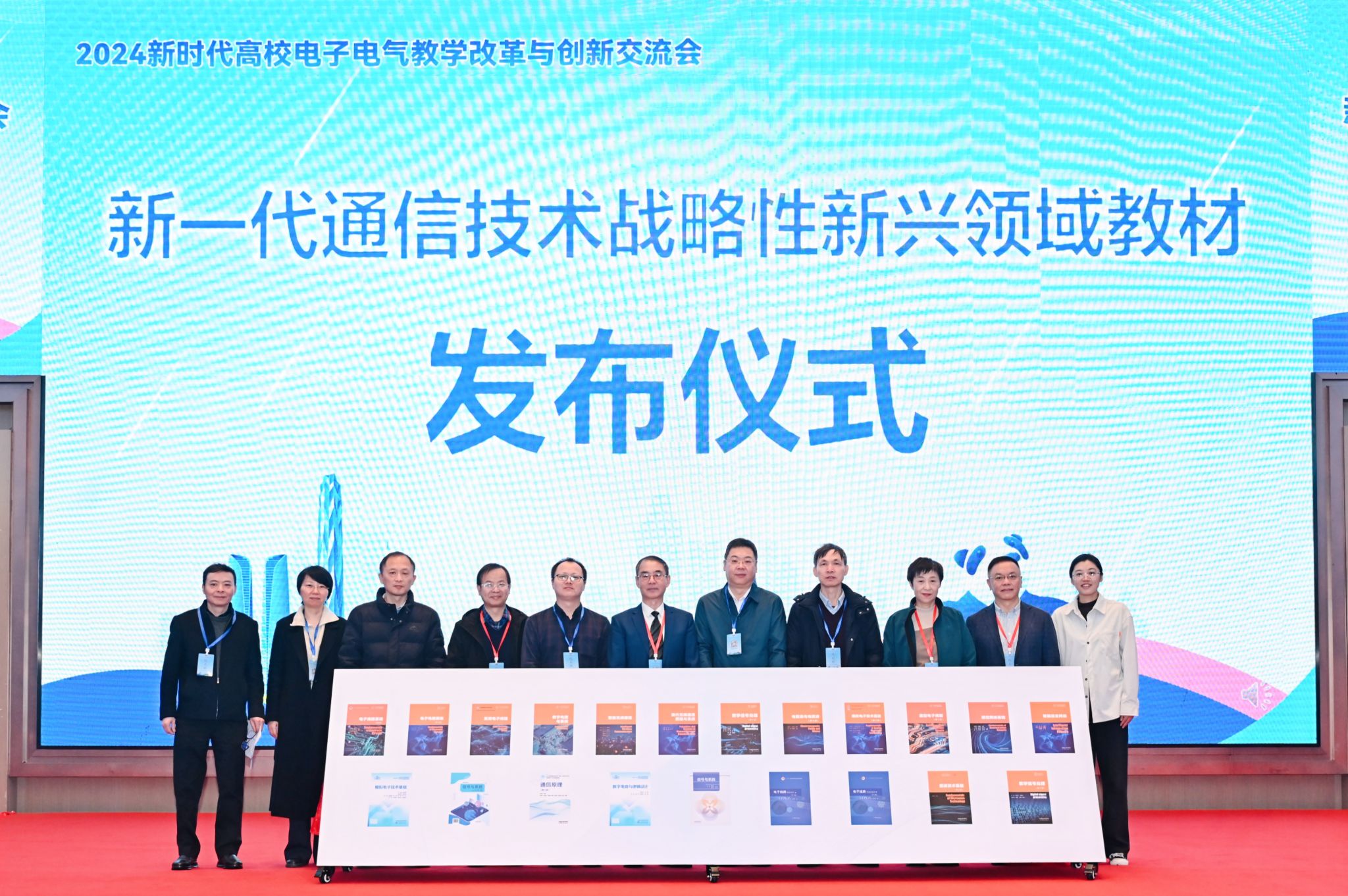接下来,大会为由太阳成集团tyc151cc、北京邮电大学、中国人民解放军国防科技大学分别牵头,联合20余所知名高校和近10家领先企业的学者和专家,与高等教育出版社合作出版的一批高质量“新一代通信技术”系列教材,举办了新一代通信技术战略性新兴领域教材发布仪式。太阳成集团tyc151cc党委常委武好明部长、太阳成集团tyc151cc副经理虞红芳教授、高等教育出版社工科事业部副主任缪可可编审,教材主编代表北京交通大学陈后金教授、哈尔滨工业大学王淑娟教授、国防科技大学马东堂教授、太阳成集团tyc151cc黄廷祝教授、杨建宇教授、潘锦教授、北京航空航天大学杨昕欣副教授、高等教育出版社王楠编辑为教材进行揭幕。