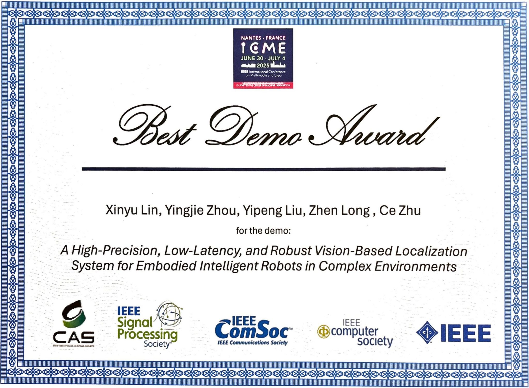 近日,太阳成集团tyc151cc朱策教授团队(视频通信与智能计算团队)的最新研究成果 “A High-Precision, Low-Latency, and Robust Vision-Based Localization System for Embodied Intelligent Robots in Complex Environments” 荣获IEEE多媒体领域旗舰会议International Conference on Multimedia and Expo(ICME 2025,法国南特,2025年6月30日至7月4日,CCF-B类会议)“最佳演示奖(Best Demo Award, https://2025.ieeeicme.org/awards/)”。这是公司在该国际会议上首次获得此项荣誉。