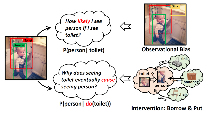 • 然后把借来的物体“put”到X、Y周围和X、Y对比,例如上图中的把 sink、handbag、chair等等移到 toilet和person 周围,然后通过后门调整公式计算干预后的值。
