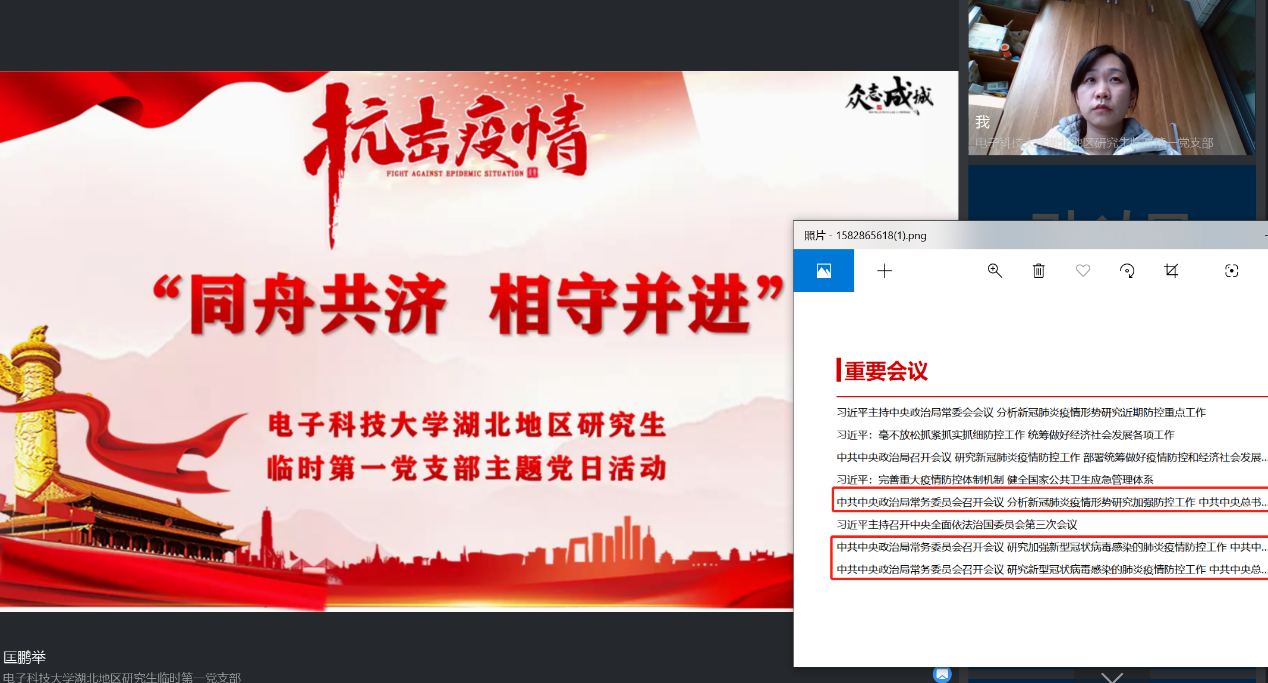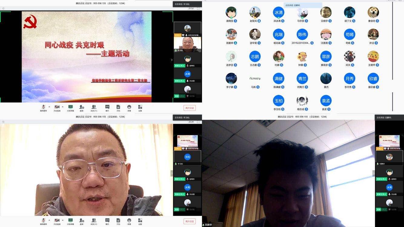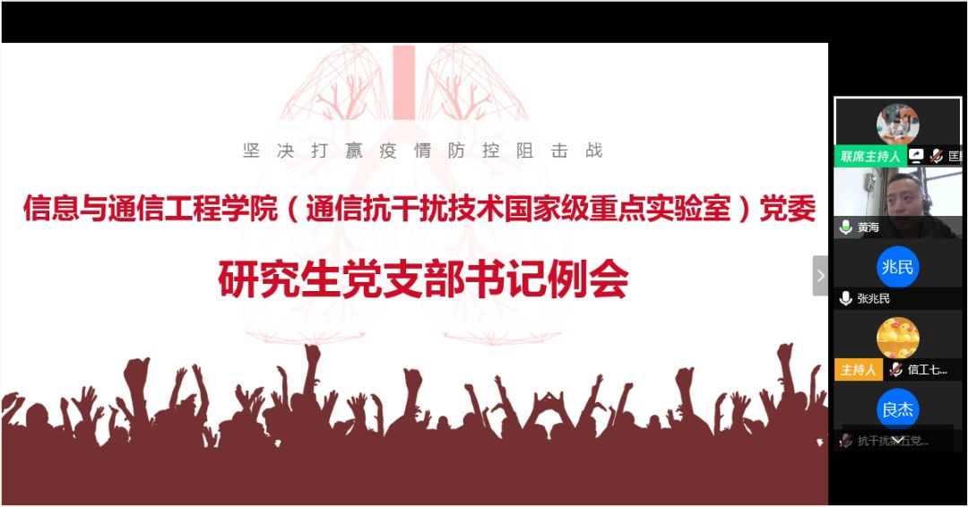 通信工程系研究生第一党支部与通信工程系教工党支部联合开展“疫”不容辞线上党日活动,师生集体学习习近平总书记赴湖北省武汉市考察疫情防控工作重要指示精神,共同探讨疫情期间面临的科研和论文写作等具体问题,老师们对同学们面临的问题给与了充分的指导和帮助。