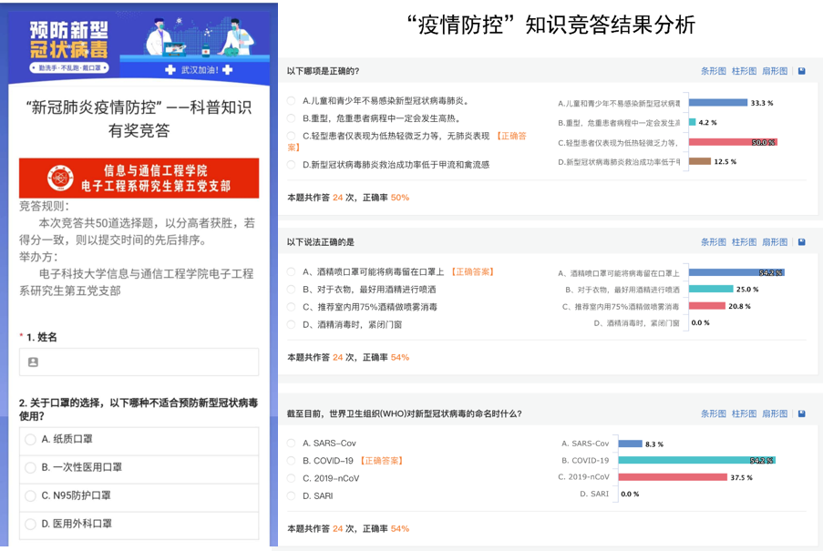 电子工程系研究生第五党支部,组织成员参加“2020年新冠肺炎防治全国统一考试”,开展“新冠肺炎疫情防控”——科普知识有奖竞答活动,提高自我防护意识和能力。电子工程系研究生第七、八党支部联合创作MV《同心抗疫,共筑大爱》,宏扬正能量,致敬所有的抗疫英雄!为武汉加油、为中国打气,期盼凛冬散尽、花见春明。