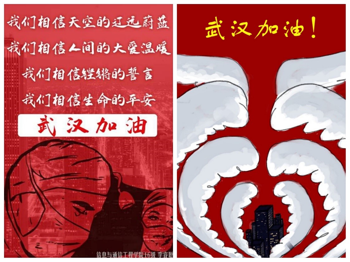 第三党支部陈钦的画中有三双翅膀,寓意疫情爆发后,前线的医务人员组成了守护武汉的第一双翅膀;坚守岗位,组成隔断传播途径战线的工作战士,是第二双守护我们的翅膀;十四万万同胞心系武汉,张开最坚实的翅膀守护这座可爱的城市和那些可爱的人。第三党支部李睿聪通过海报设计,展现国家的大爱与誓言,相信人间的大爱温暖,相信誓言的铿锵有力,用真情实感和实际行动,为战士们加油,为中国加油!