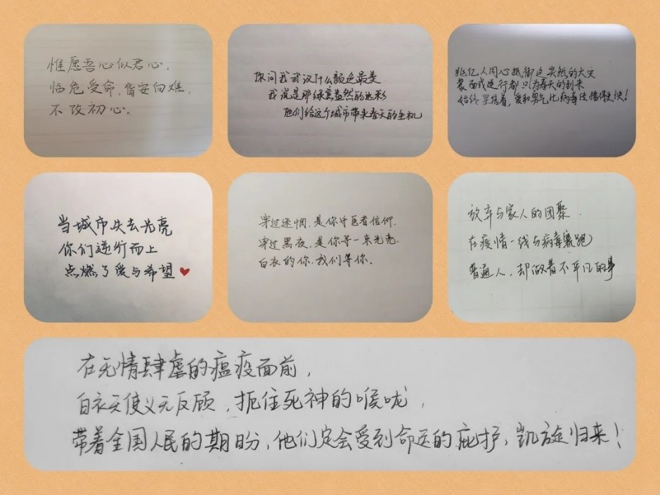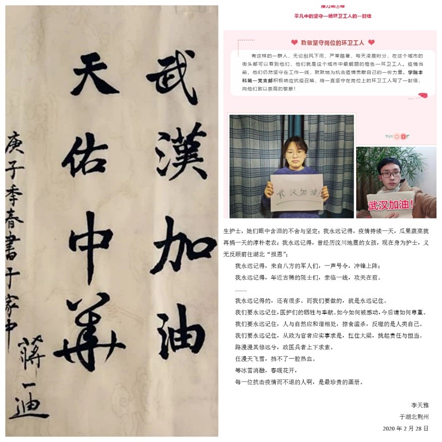 第一党支部积极响应抗疫号召,给始终坚守在岗位上的环卫工人写了一封信,向他们致以崇高的敬意;李天雅从自己作为湖北人的所见所感出发,表达对抗疫战士的感谢和祝福。第三党支部蒋一迪通过书法作品表达这场战斗必将胜利的决心和信念。第七党支部通过三行情诗的形式表达自己的思考与希冀。