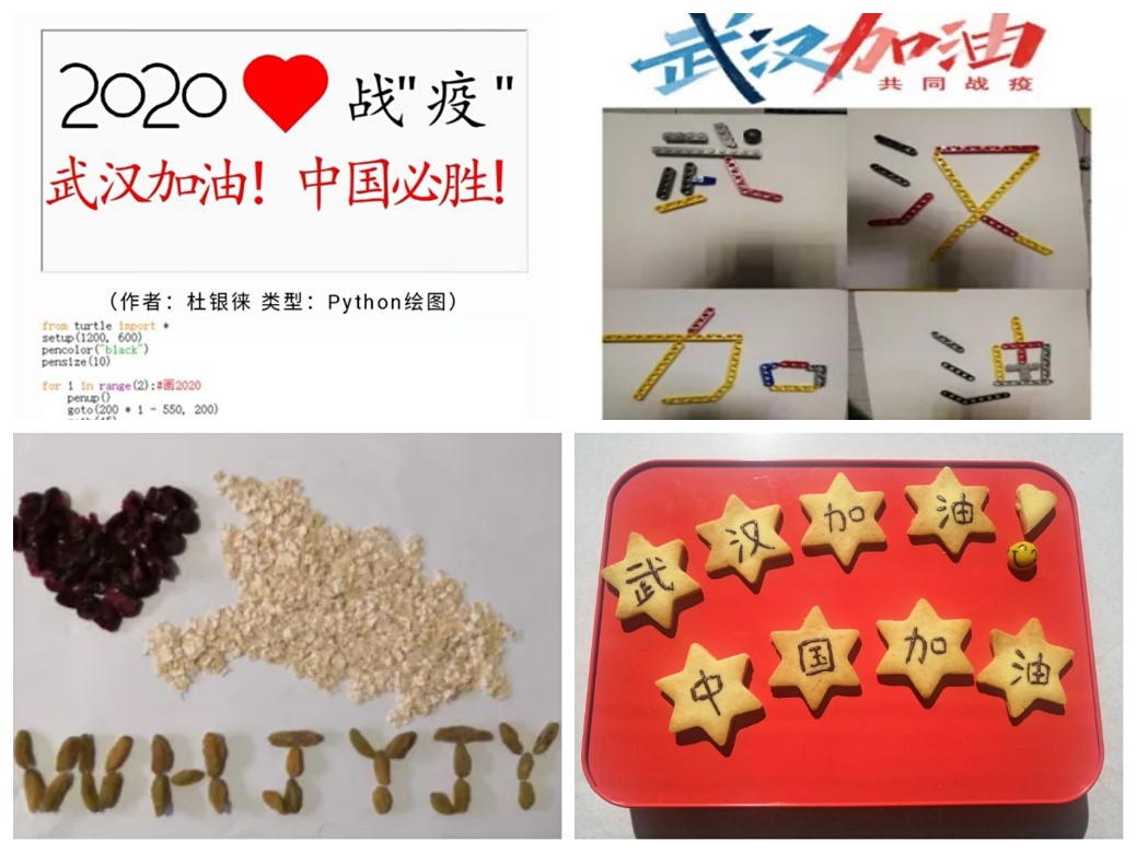 第四党支部杜银徕用假期新学到的知识——Python画图创作,致敬伟大的医务工作者们,为武汉加油,为中国加油;陈皓婷通过乐高积木拼装图案表达自己内心的期盼与祝福;邵楠、杨裕强等通过烘焙、食物摆盘等方式为祖国祈福,同时勉励大家健康饮食,适当锻炼。