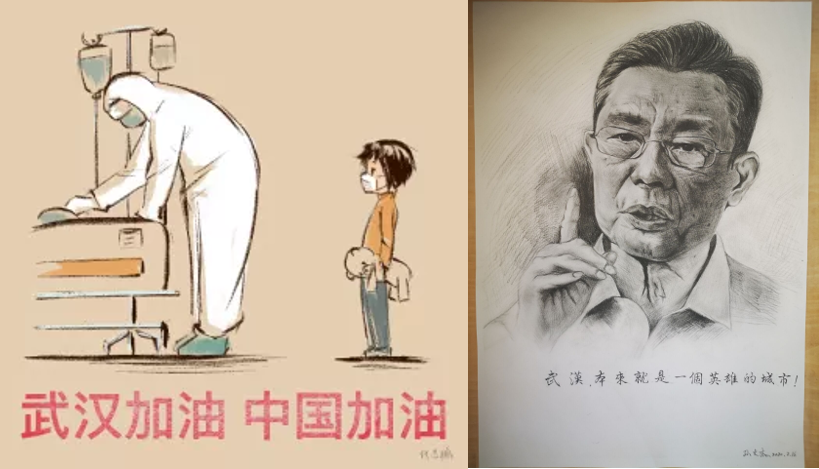 第四党支部代志鹏以画作向在武汉一线奋战的医务工作者致敬,画中有两个人,孩子代表生命的希望,医生代表职责与使命,医生在一线艰苦工作,为拯救更多的生命而宵衣旰食,全国人民众志成城,共同抗击疫情。第八党支部孙文杰为钟南山院士画像,医者无惧,国士无双,愿春暖花开,愿岁月如常,中华民族有力量!