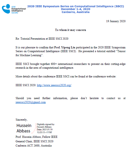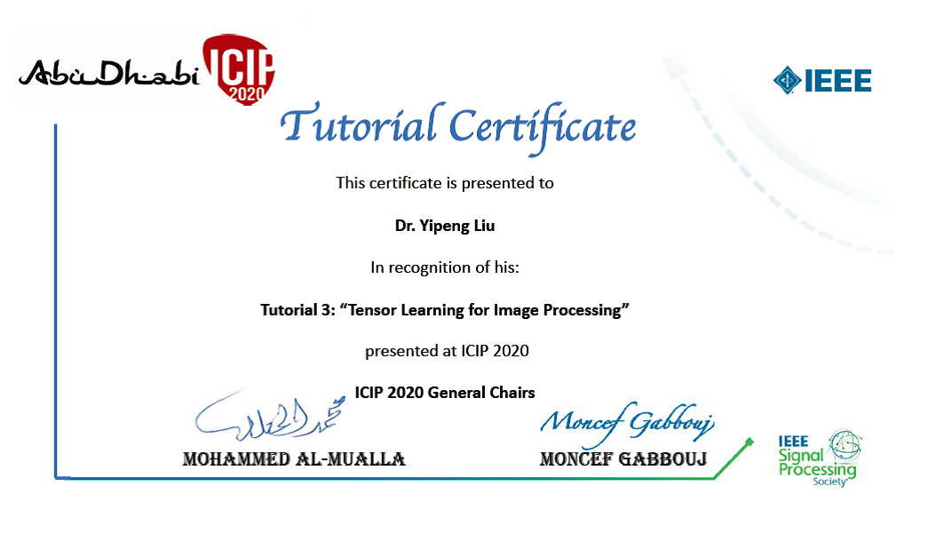 为了总结团队和同行近年的主要研究进展,刘翼鹏梳理了张量数据分析的技术体系,从理论、方法和应用层面系统性的构建张量计算推广数据分析技术的体系。近三年他陆续受邀在行业多个旗舰会议作讲习班报告,推广张量数据分析技术和应用,包括ISCAS 2019 (IEEE电路与系统国际会议:IEEE International Symposium on Circuits and Systems)、ICIP 2020 (IEEE图像处理国际会议:IEEE International Conference on Image Processing)、SSCI 2020(IEEE计算智能大会:IEEE Symposium Series on Computational Intelligence)等。