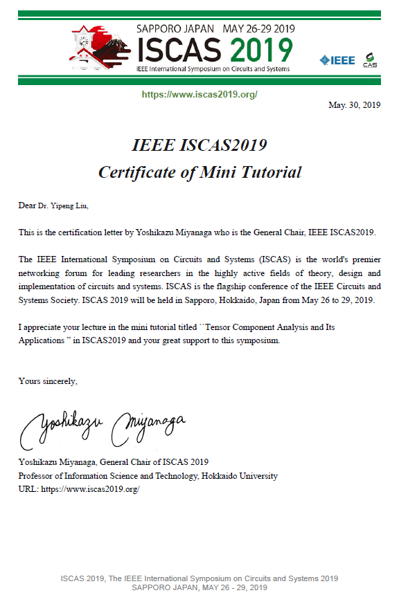 2019年05月,刘翼鹏在ISCAS 2019的讲习班报告受到了参会同行学者的关注和积极评价,还收到了国际著名出版机构斯普林格(Springer)出版集团主任编辑邀请,撰写有关张量数据分析方向的著作。