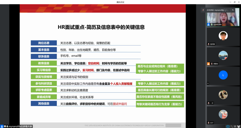 刘老师主要从“认识中国电科第十四研究所、HR如何看简历、如何做好一份简历”三方面为大家进行分享和讲解。