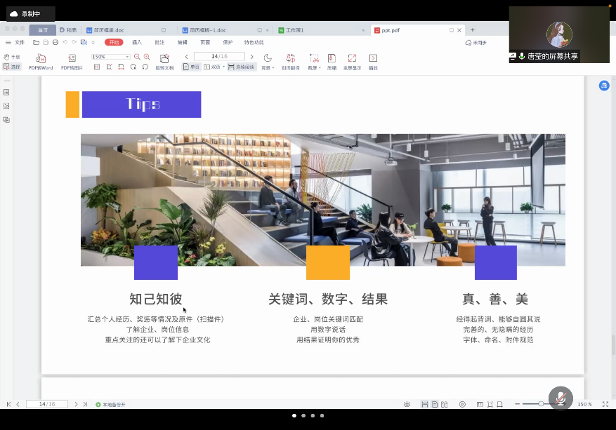 最后,唐老师还介绍了一些简历书写的技巧。第一点是“知己知彼”,要汇总个人经历,了解企业信息;第二点是“关键词、数字、结果” ,在简历中要明确与岗位相关的关键词,尽量用数字说话,有结果支撑;第三点是“真、善、美”,简历内容要经得起考验、经历要完善无隐瞒、总体要规范美观。