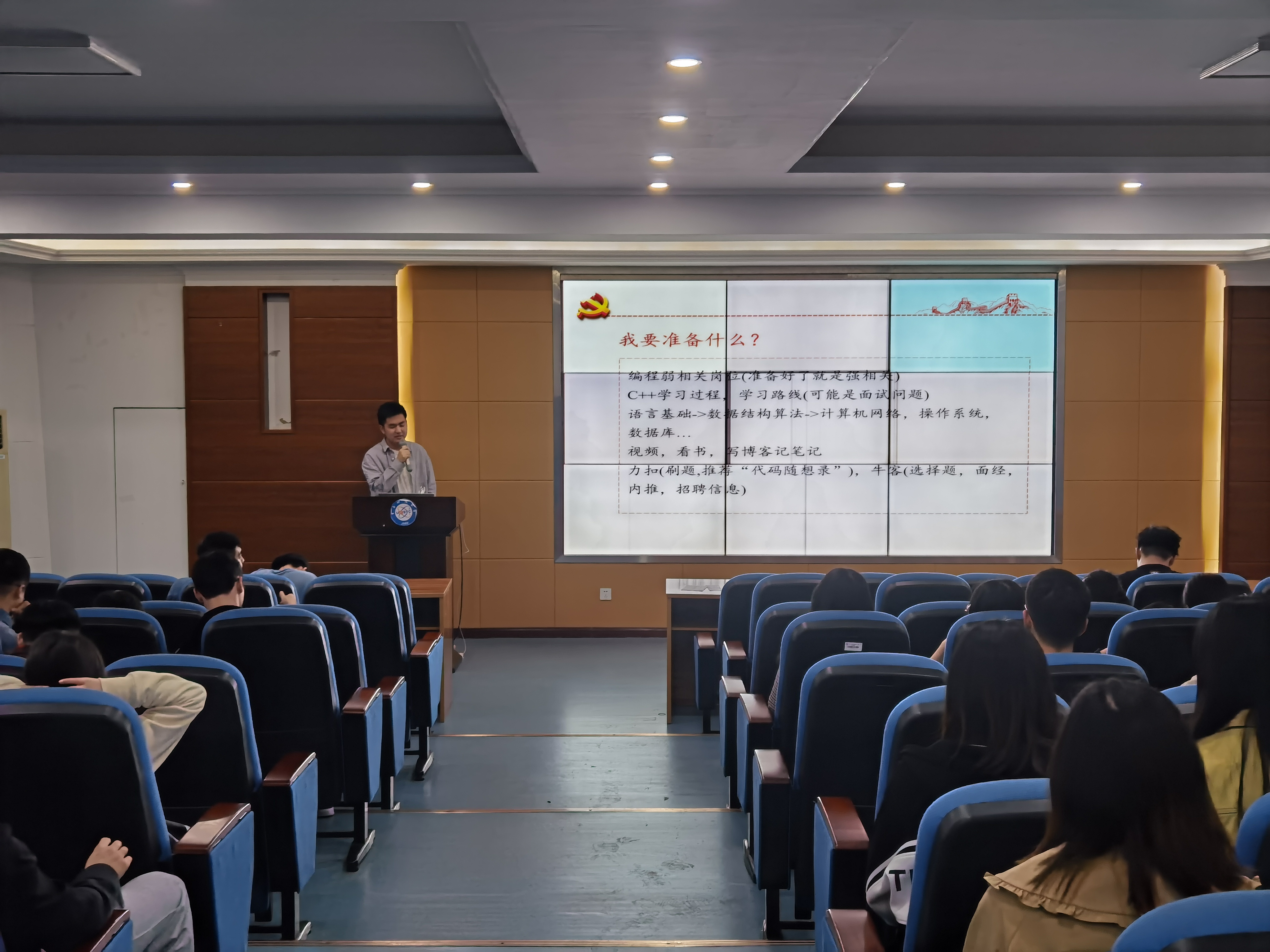 首先由电子工程系研究生第一党支部的赵莹辉同志开始,他即将成为TP-LINK的一名系统测试工程师。赵师兄分享了他在投递简历之前的准备工作,包括打好编程语法基础、夯实面试经典问题、网罗各单位就业信息等。赵师兄表示,一定要在简历中突出重点,并自信从容地回答面试官的每个问题,同时,投递简历也要重点考虑工作地点和目标岗位。