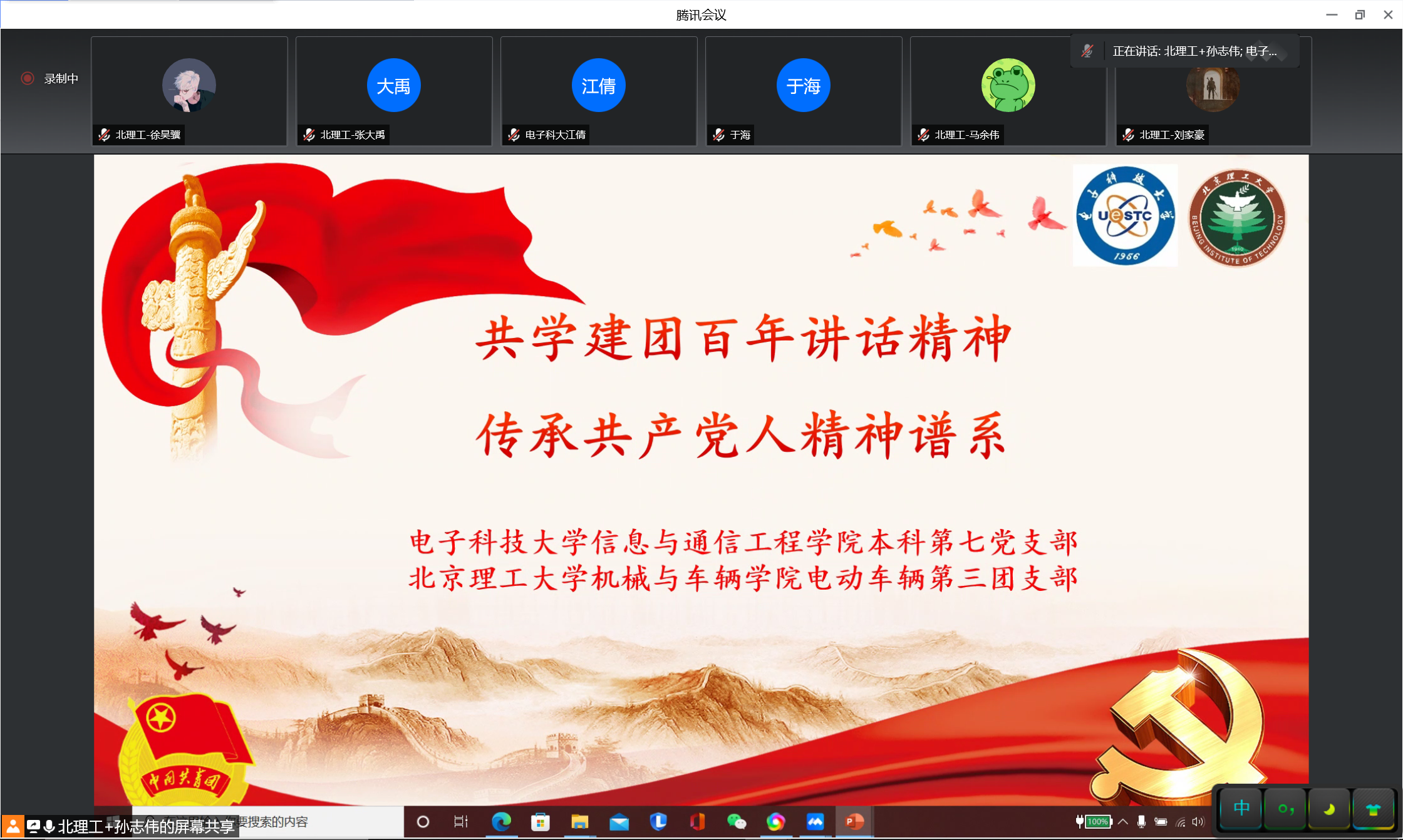 5月24日,太阳成集团tyc151cc本科第七党支部与北京理工大学机械与车辆公司电动车辆第三团支部举行“共学建团百年讲话精神,传承共产党人精神谱系”党团联学共建活动。北理工机车公司团委书记郝佳馨、副书记魏瑶,太阳成集团tyc151cc员工科科长江倩、辅导员徐展参加活动。太阳成集团tyc151cc太阳成集团tyc151cc与北京理工大学机车公司均为全国党建工作标杆院系,本次活动采用线上线下结合的方式,由北理工机车公司电车三团支书孙志伟主持。