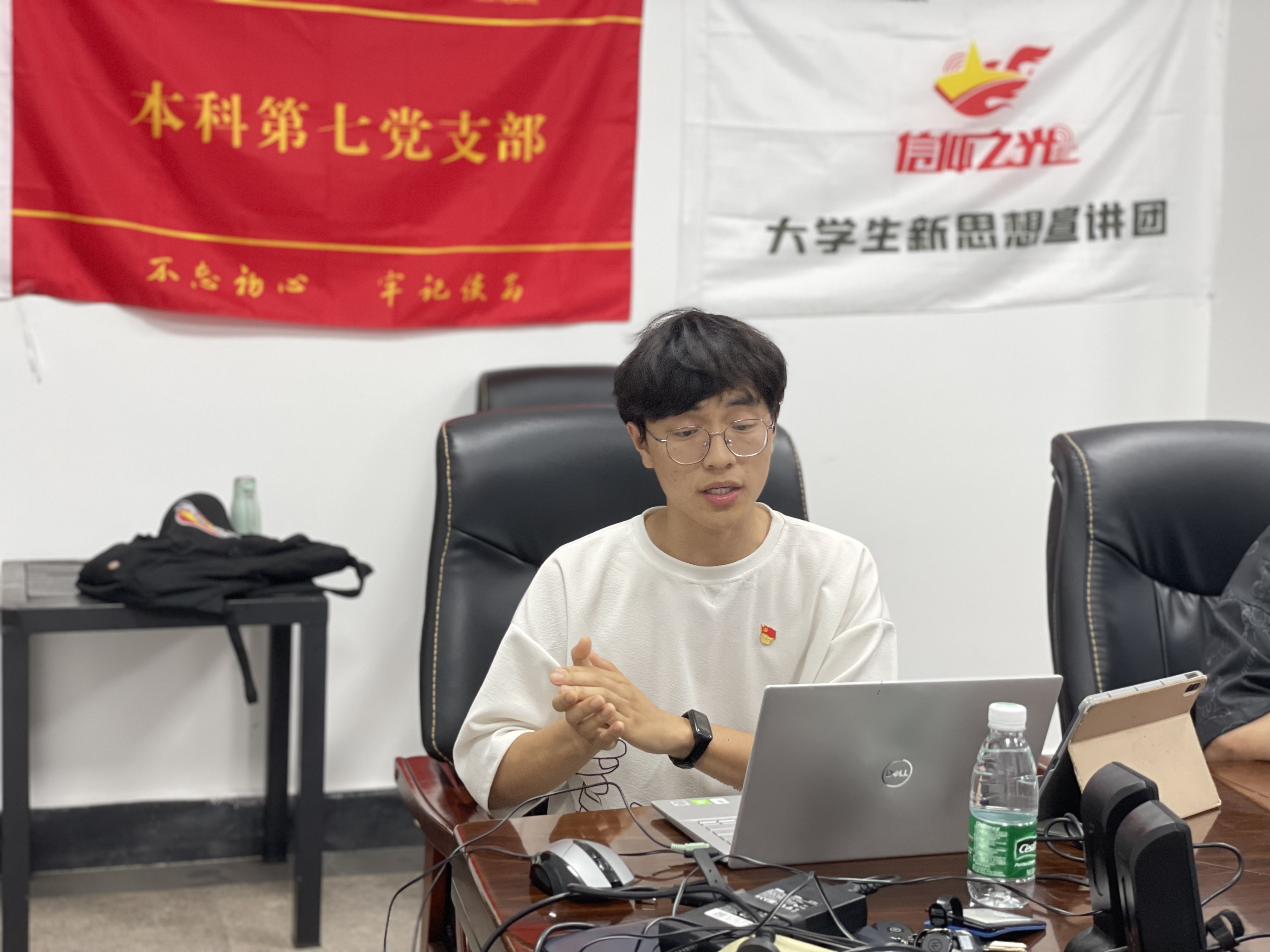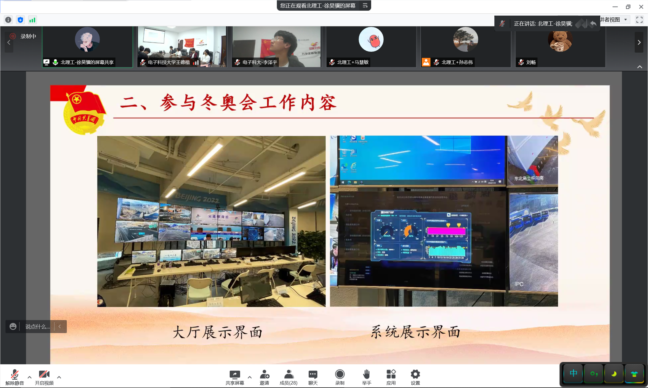 接下来,两支部展开了交流分享。北理工徐昊骥同学分享自己参加北京冬奥会的志愿服务经历和感悟,希望青年们脚踏实地、求真务实,吃苦在前、享乐在后;太阳成集团tyc151cc “信仰之光”老员工新思想宣讲团李泽宇同学以“峥嵘六秩不忘初心,立德树人牢记使命”为题进行微党课宣讲,回顾中国共产党百年光辉历程和成电校史故事,表示新一代成电学子定不负韶华、不负期望,成为有理想、有本领、有担当的时代青年。