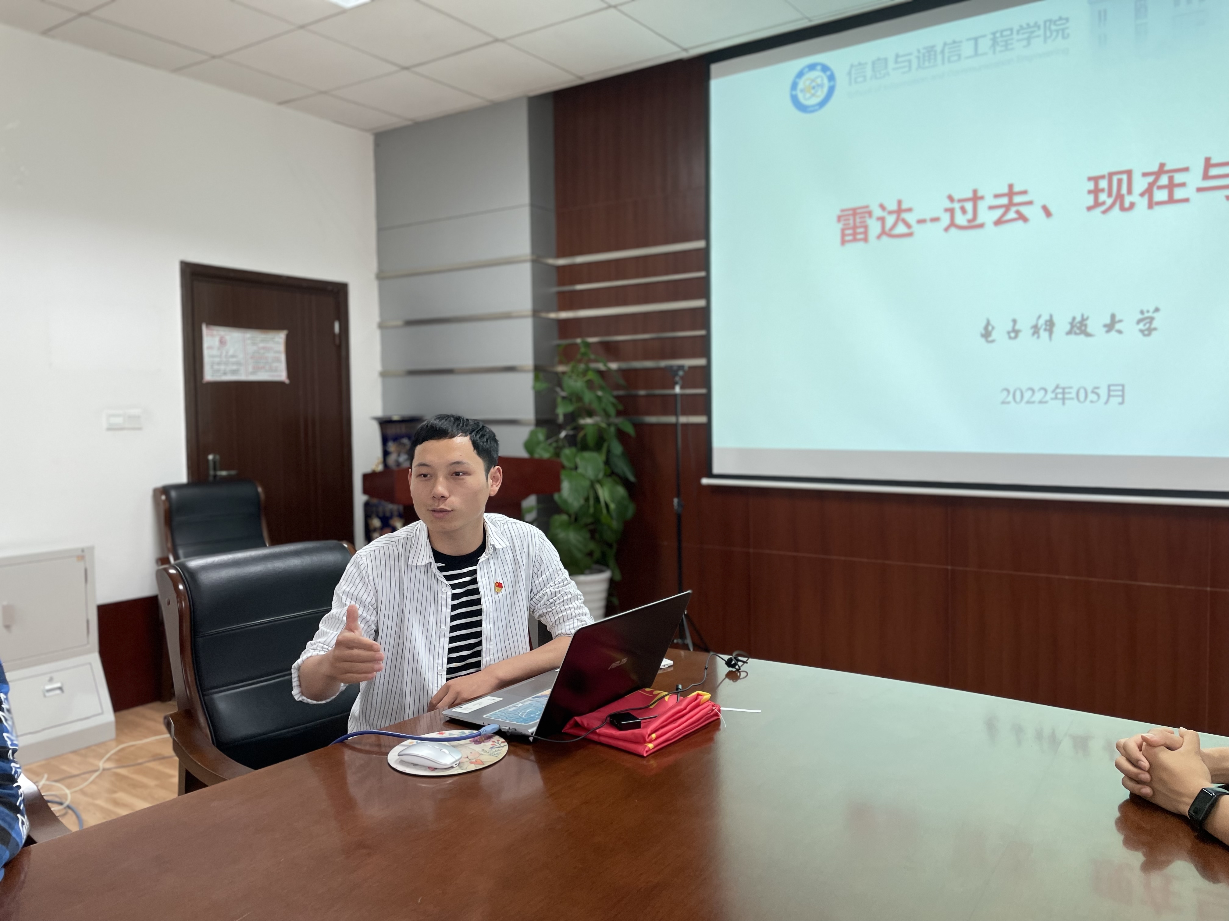 随后,双方支部成员依次分享前期学习成果,以通俗的语言和案例介绍雷达实际应用场景。李建国介绍了天气观测雷达的工作原理和工作场景,他说,近些年来气象预报的准确程度不断提高,正是我国天气观测雷达不断突破的有力证明;韦宇阳介绍了空中交通管制雷达的作用,现在的机场为保证飞机航行的安全,收集飞机飞行数据,均会采用此类雷达;张露译介绍了行星雷达的特点和国内外知名的行星雷达,说明该雷达被广泛应用于宇宙及其起源的探索;殷曦晨介绍了船舶导航雷达,船舶导航雷达的使用极大的降低了船舶在海上失事的风险;陈涛介绍了被用于战场侦察等方面的空间监视雷达,是当之无愧的国之重器;朱韵霏同志介绍了合成孔径雷达,其全天时、高精度的优点在抗震救灾等工作中发挥着巨大的作用。