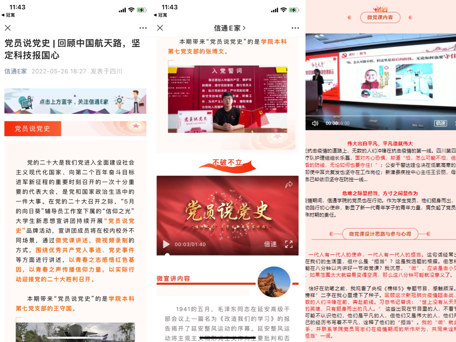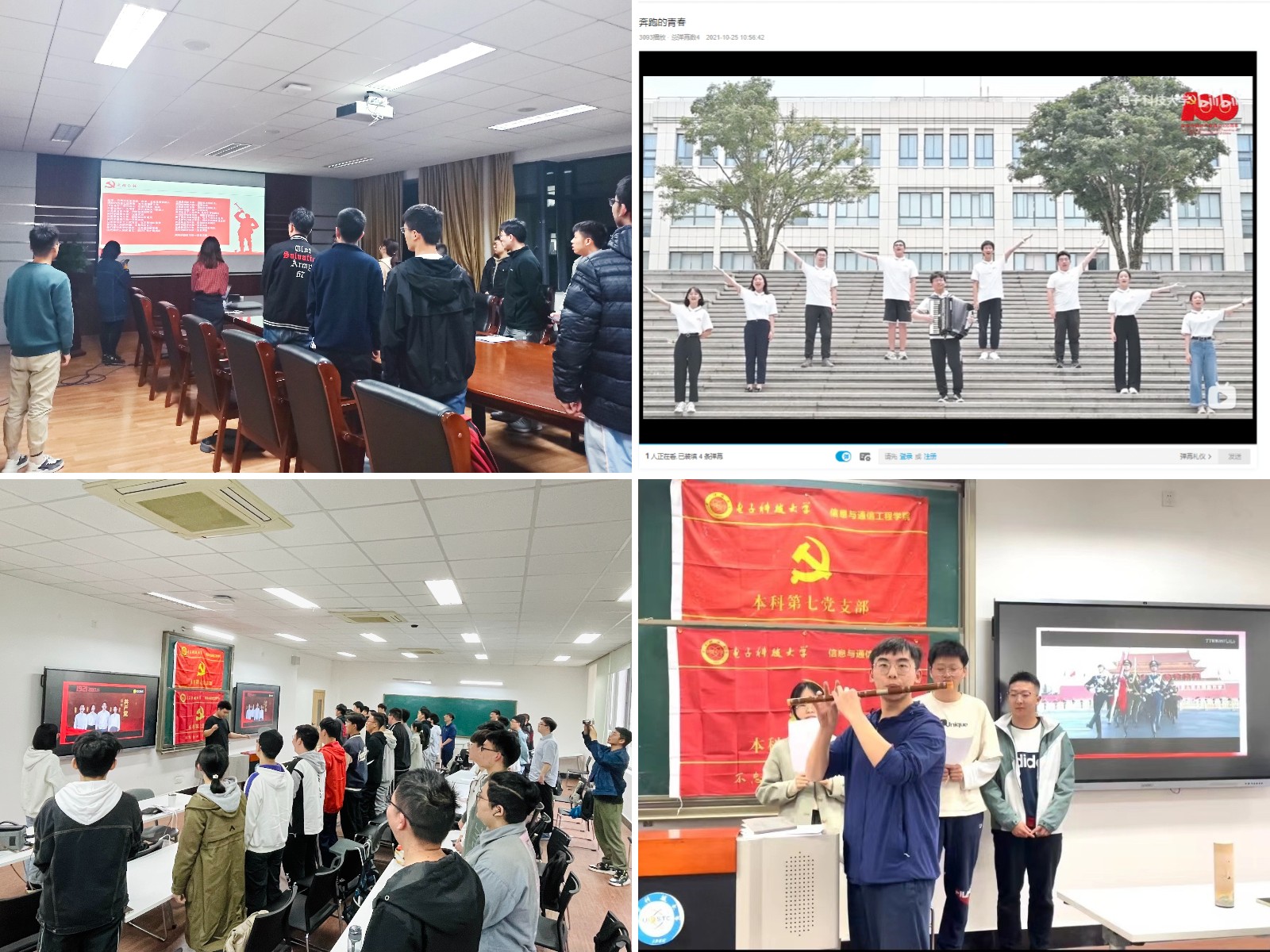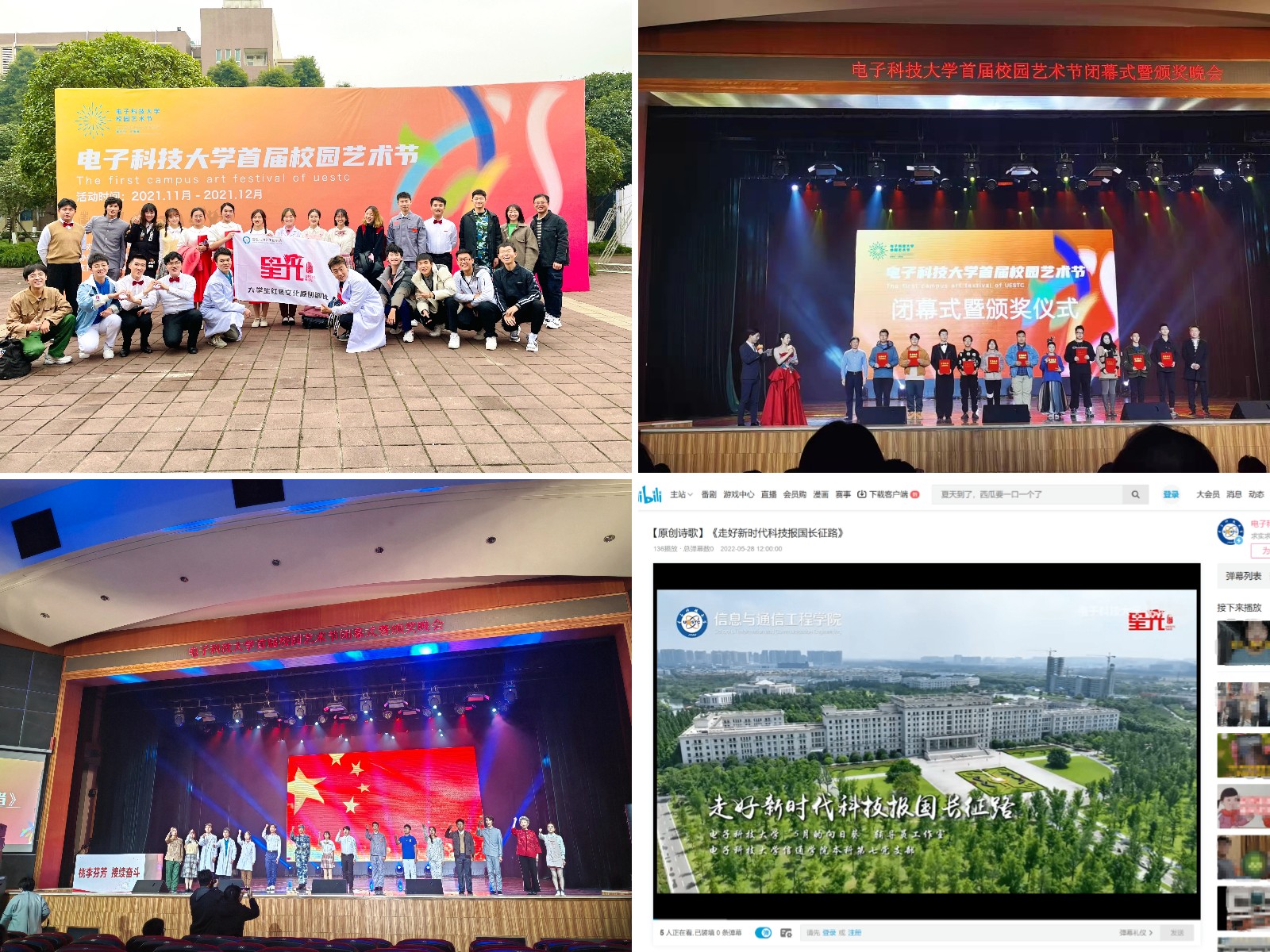 由支部成员担任主创及主演的情景剧《爱国情 奋斗者》和诗歌朗诵《走好新时代科技报国长征路》深情讲述了一代代成电人“爱国奉献,科技报国”的使命担当,均斩获首届校园艺术节一等奖。截止目前,两个原创作品已面向全校各类员工群体进行演出,覆盖2000余人,受到热烈好评。支部朗诵视频在公司官方媒体平台发布,并参与由四川新闻网传媒集团和四川发布主办的“青春中国”大型线上接力活动,将在四川新闻网、“学习强国”等数十家新媒体平台展播。