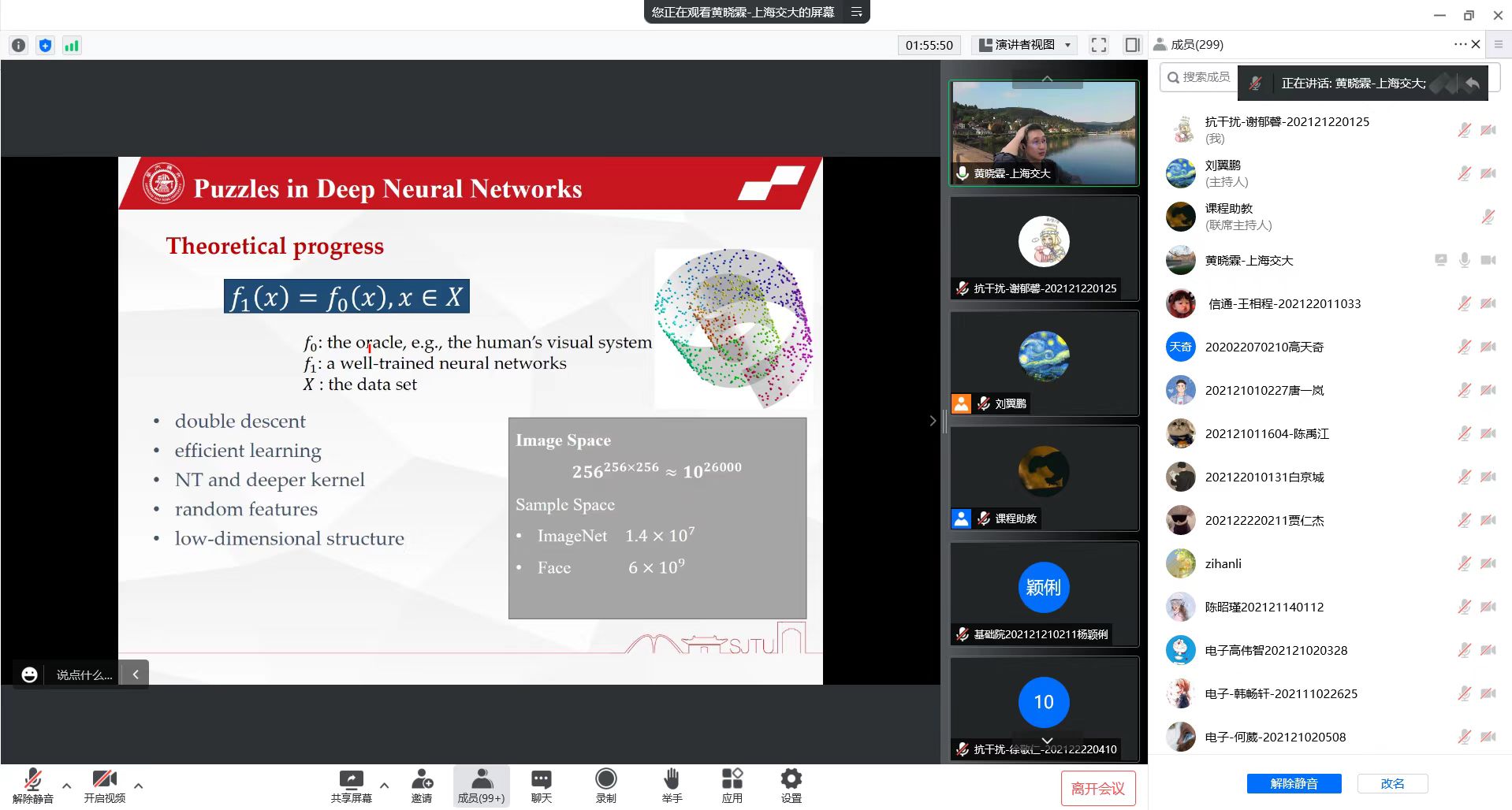黄晓霖从第四届交流月开始开设的“机器学习研究中的优化方法” 课程深受员工欢迎,今年,黄老师继续在线上为同学们带来了“神经网络的动态低维结构与稳健性提升”讲座,同学们的热情丝毫不减,在线上与老师展开热烈讨论。