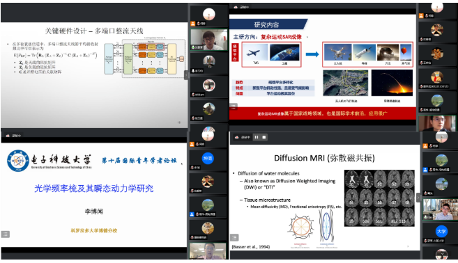 学科讲堂上,沈善普、蒲巍、李博闻、张帆4位青年学者分别作了题为“赋能无电池物联网”、“复杂运动合成孔径雷达成像”、“光学频率梳及其瞬态动力学研究”、“基于弥散磁共振图像的全脑白质计算与分析”的特邀报告,并与参会学者们、同学们进行了互动交流。