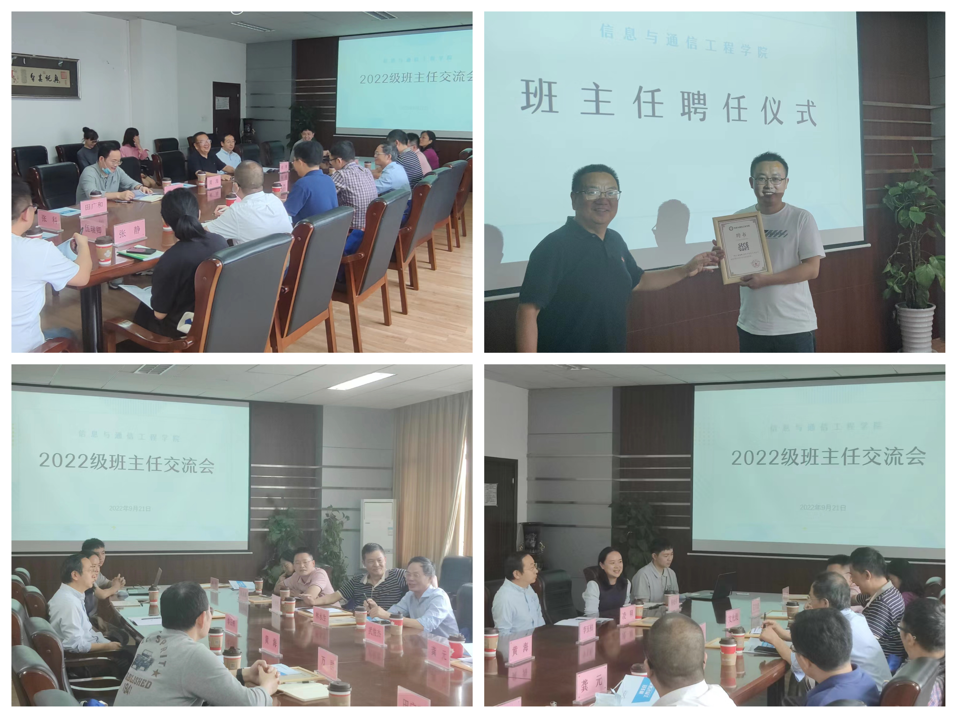 聘任仪式结束后,信通2022级辅导员与各位班主任交流工作情况,主要包括年级情况介绍、员工特点分析、班主任工作任务、辅导员经验分享四个方面。各位辅导员向班主任们详细介绍了2022级公司员工男女比例、员工情绪管理能力、生活环境适应能力、入党积极性等各个层面的具体情况,同时也希望班主任们能主动与同学们进行深入的交流,能够结合自己的研究方向对新生的学习和职业规划进行细致的指导。