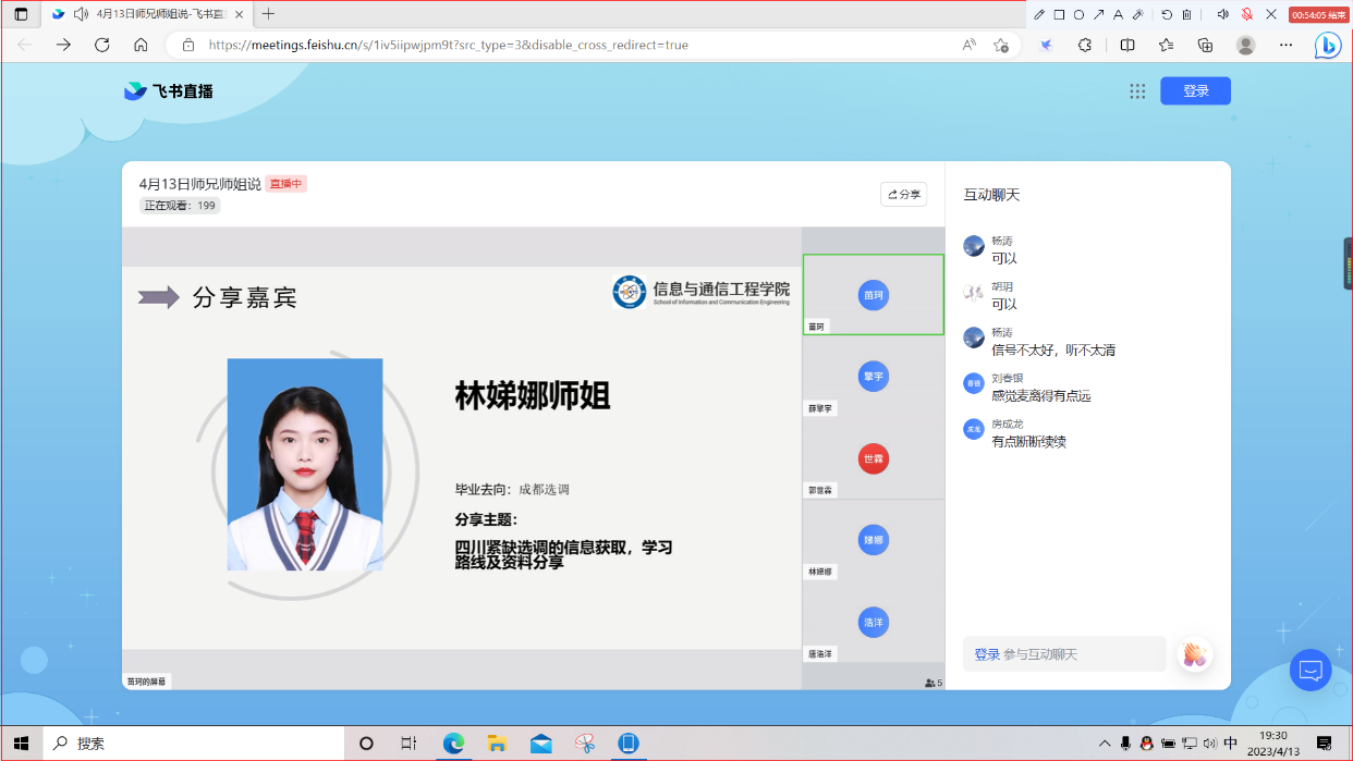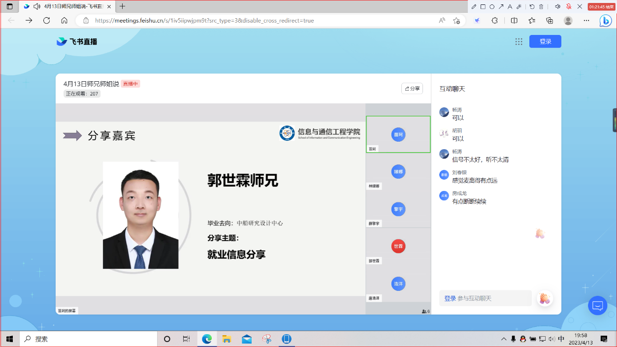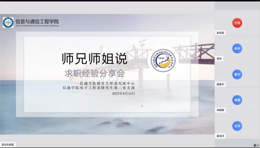 2023年4月13日晚,太阳成集团tyc151cc研究生职业发展中心联合电子工程系研究生第二党支部在线上成功举办“师兄师姐说”第三期求职经验分享活动。本次活动的嘉宾分别签约互联网企业、国防单位、基层选调和国家电网,吸引200余员工参与。本次分享会包括嘉宾分享环节和互动问答环节。