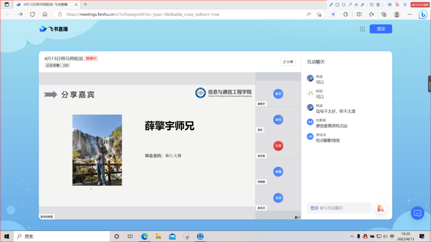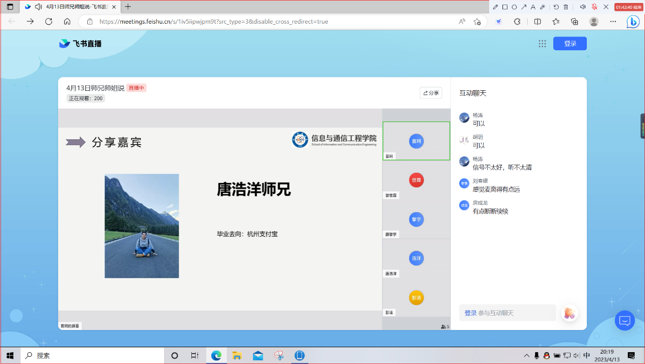 首先,签约浙江天猫的薛擎宇师兄以互联网求职就业经验分享为主题,从求职准备、语言学习、求职时间线和笔试面试等角度进行了详细的介绍。薛师兄还为师弟师妹们分析了其他多个就业方向的优缺点,建议大家早做准备,早投简历,积极联系已经入职的员工了解信息,掌握意向单位的真实情况。