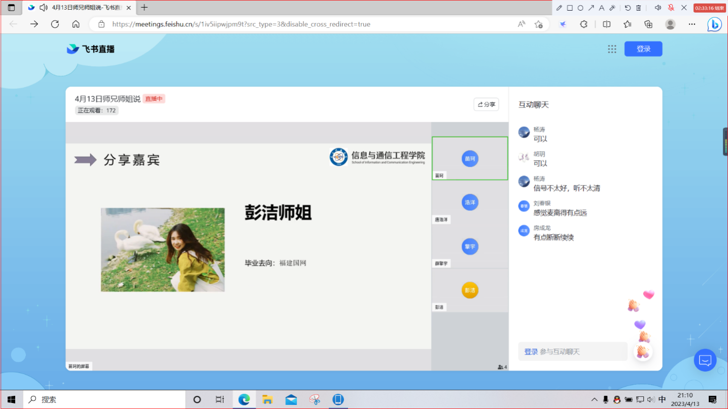 最后,签约国网福建省电力有限公司厦门供电公司的彭洁师姐以国网求职历程与非技术类求职经验分享为主题,从招聘信息获取、基础知识学习、国网招聘流程和非技术类私企等方面进行了详细的介绍。彭师姐把面试过程中可能遇到的问题和招聘细节都做了清晰的解释,耐心地分享了个人经验,对同学们启发很大。