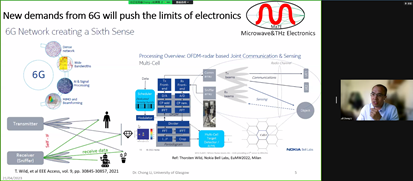 本次论坛的后半程由Chong Li老师以“通过集成电子设备增强太赫兹应用”为主题进行学术报告。Chong Li老师指出,对高速无线/移动通信和高分辨率雷达和遥感的需求不断增加,导致了对亚毫米波和太赫兹频率的探索。而6G的新需求将推动电子器件的性能极限。然后,Chong Li老师回顾了太赫兹电子器件的最新发展,重点介绍了SiGe/Si CMOS和III-V等主流半导体技术。之后,Chong Li老师详细介绍了格拉斯哥大学,特别是微波和太赫兹电子器件(MaTE)研究小组,在这一领域相关的研究活动和重要成果。最后,Chong Li老师还介绍了片上测试和TiC6G集群系统。