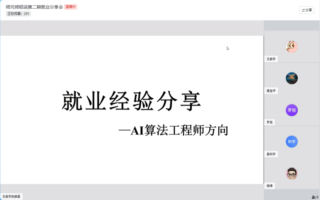 第三位分享的是签约中兴通讯-蓝剑计划的王辰宇师兄,他分享的是AI算法工程师方向就业经验。王师兄重点分享了对AI领域的理解,梳理了AI算法的学习在不同阶段应该掌握的知识和技能,并且推荐了对应的学习资料,帮助师弟师妹们理清了学习路线。