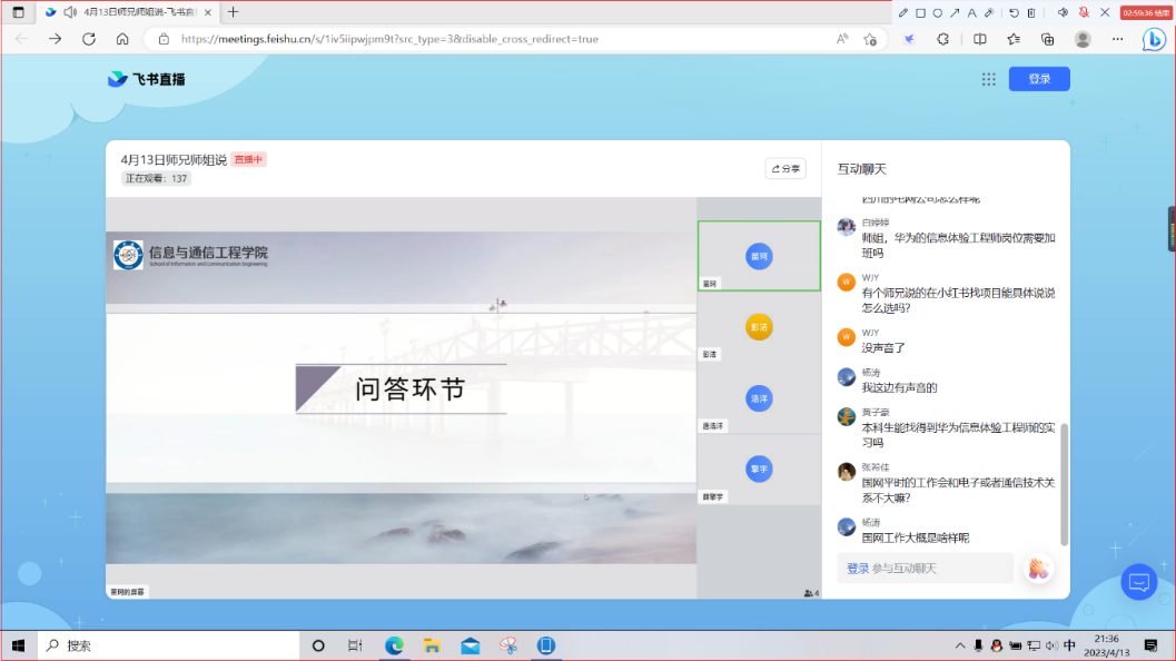 在互动问答环节,同学们与师兄师姐们积极互动交流。本次活动持续3个小时,干货满满。通过此次活动,同学们充分积累了求职就业的相关经验,了解了本专业的不同职业选择,明确了个人未来的职业发展方向。