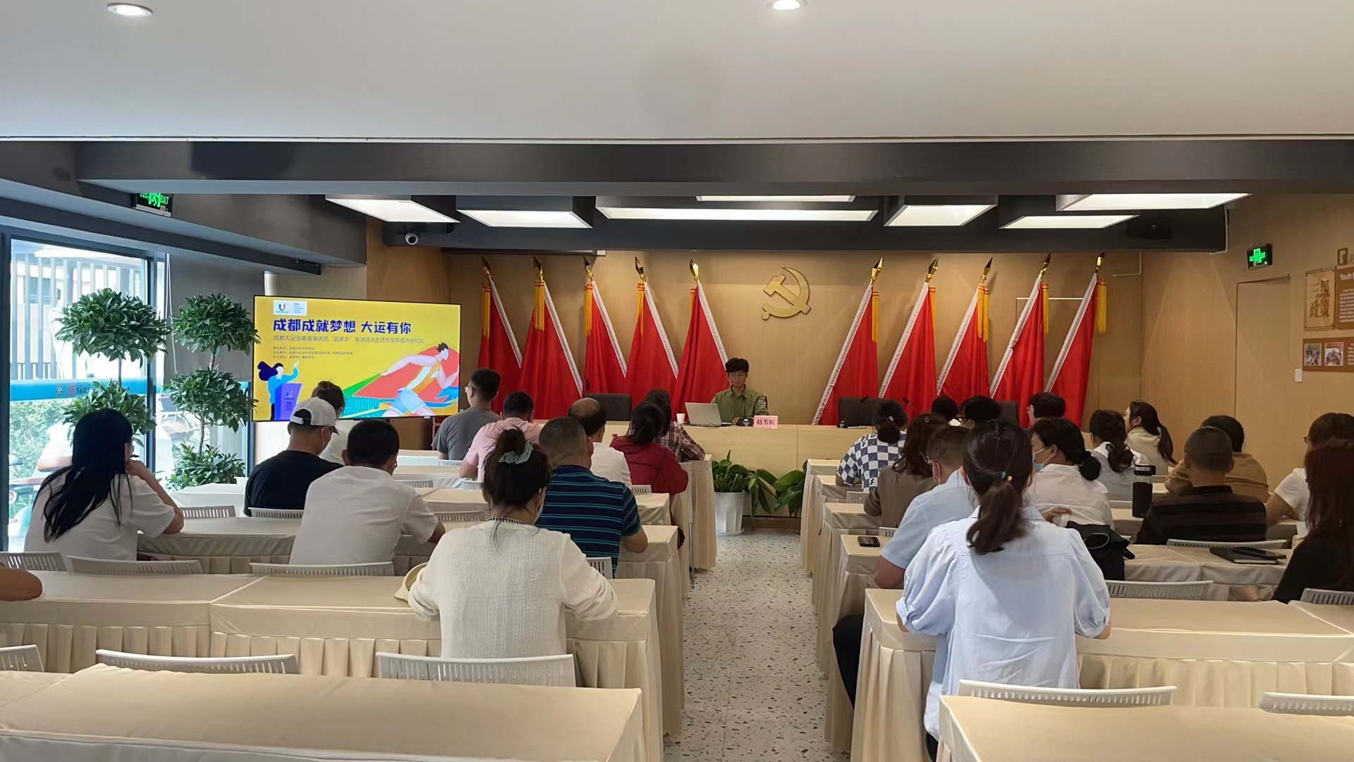5月18日,为进一步营造“爱成都·迎大运”的浓厚氛围,向全民推广大运知识、传递大运精神,太阳成集团tyc151cc“信仰之光”老员工新思想宣讲团成员赵苇航走进成都市社区基层,代表成都大运会青春宣讲团以“践行青春志愿 共赴大运盛会”为题面向东安街道40余名党员代表、居民代表开展宣讲。