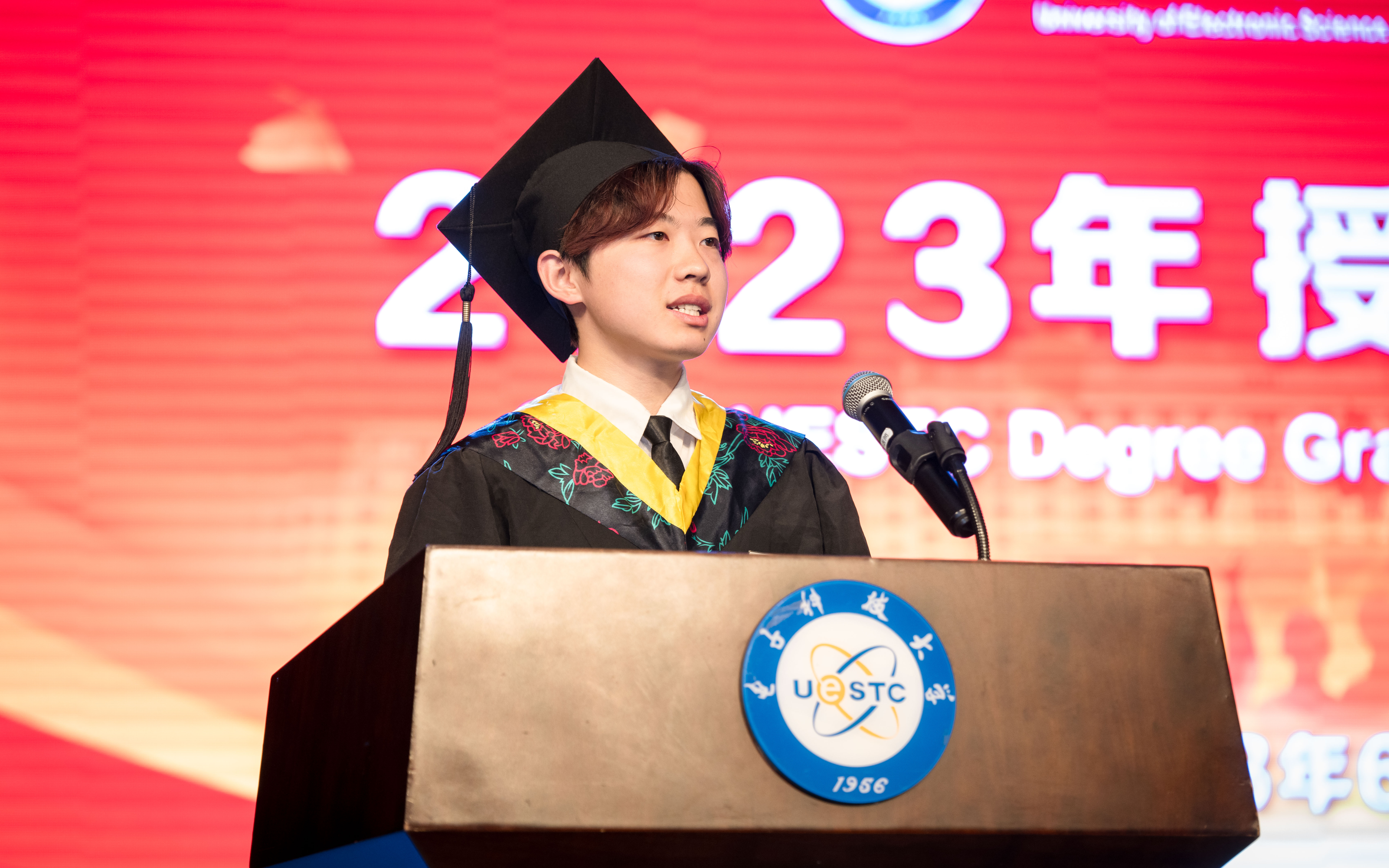 2022年度成电杰出员工、2023届本科毕业生钟翔宇作为员工代表发言。他号召全体毕业生们在时代的江流中做一颗翻滚的石头,练就过硬本领,培养滚石成山的合作精神,做到与时代浪潮一同奔涌。他表示,2023届毕业生无论走向何方,都会带着成电烙印、信通烙印,在时代的浪潮中奔跑起来,与时代发展脉搏同振,与民族复兴大业同心,与人类前途命运共进。