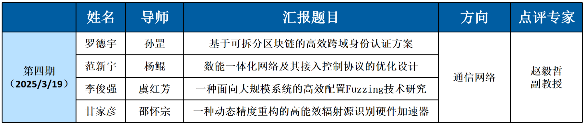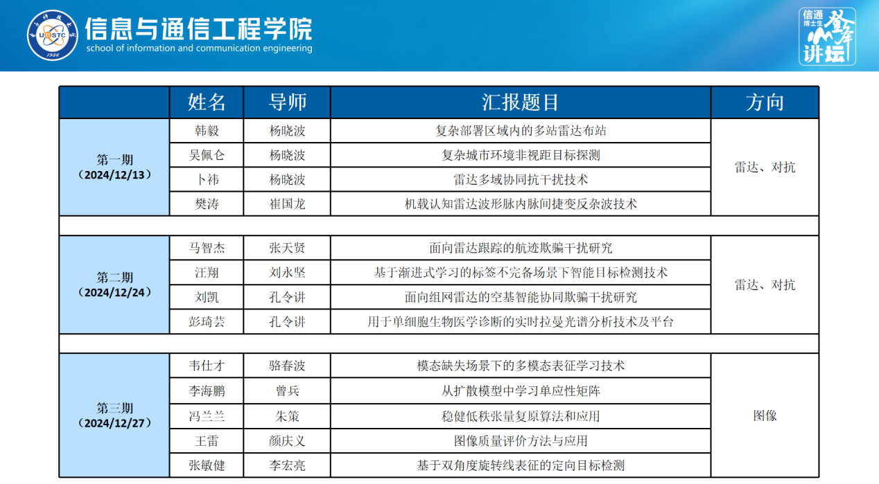 目前,讲坛已成功举办三期,来自雷达与对抗、图像处理等研究方向的优秀博士生依次登台,围绕多站雷达布站、单应性矩阵、图像质量评价方法与应用等前沿领域展开报告。每场报告均设有专家点评环节,张天贤、袁野、龙珍等老师从应用前景、理论深度、技术路径、汇报技巧等维度给予了专业指导。
